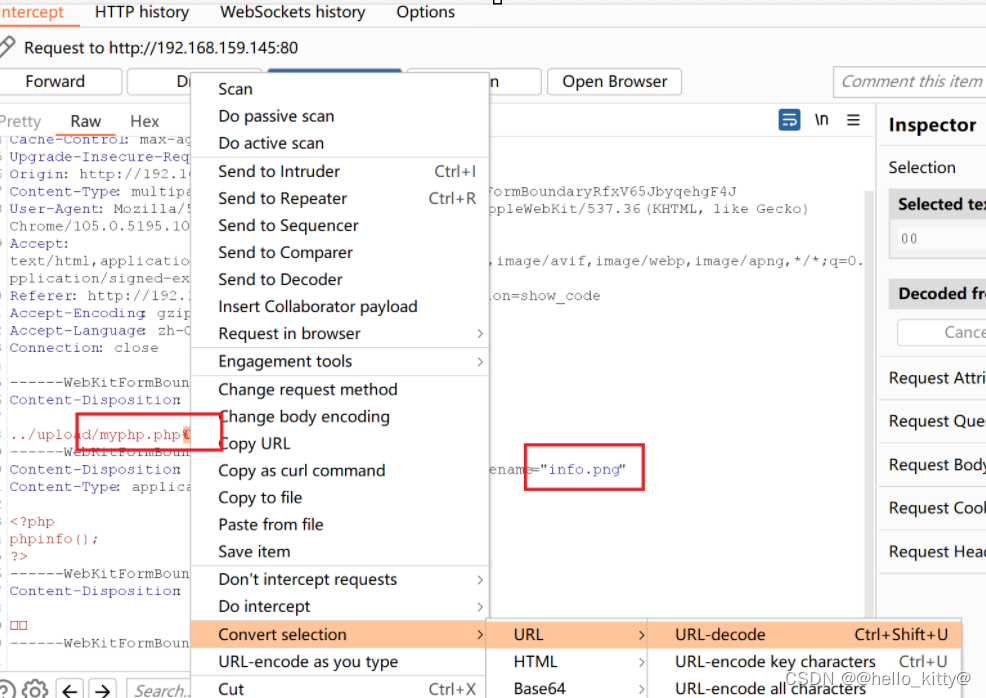 这里需要注意的是 GET 型提交的内容会被自动进行URL解码,在POST请求中,%00不会被自动解码,所以我们还需要对输入的%00进行url解码操作,首先选中 %00 ,右键单击,选中Convert selection--URL---URL-decode 进行url解码