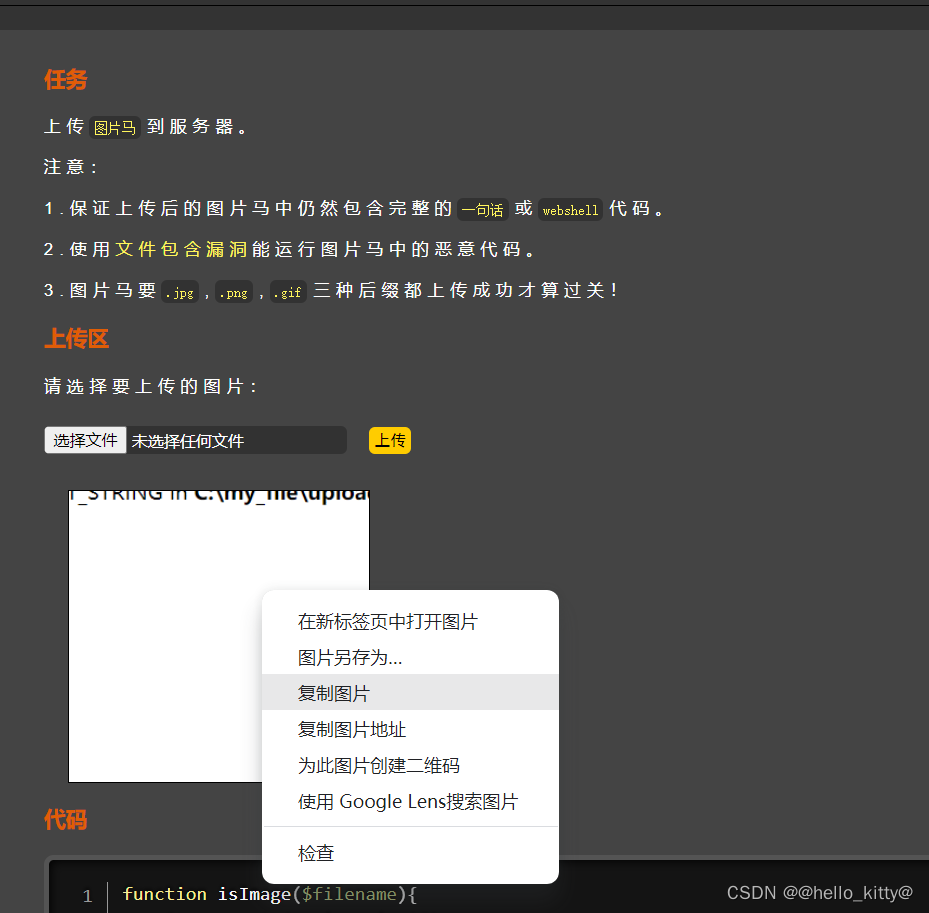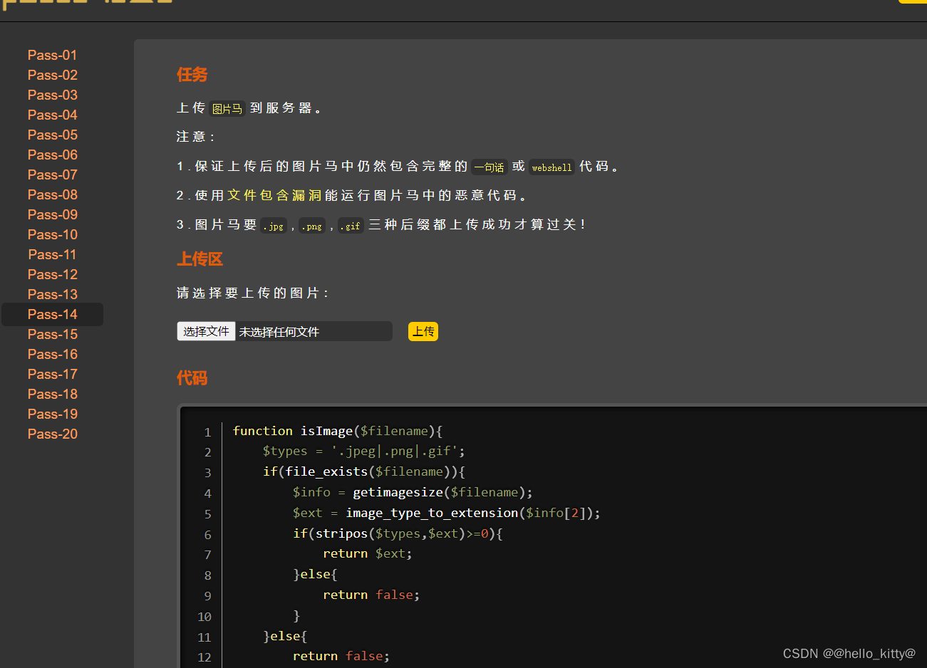 getimagesize()在获图像信息的时候,会涉及到图像的读取,此时我们可以利用该漏洞,上传图片马。制作过程同第十三关(十三关题解),使用copy命令,然后上传图片马。