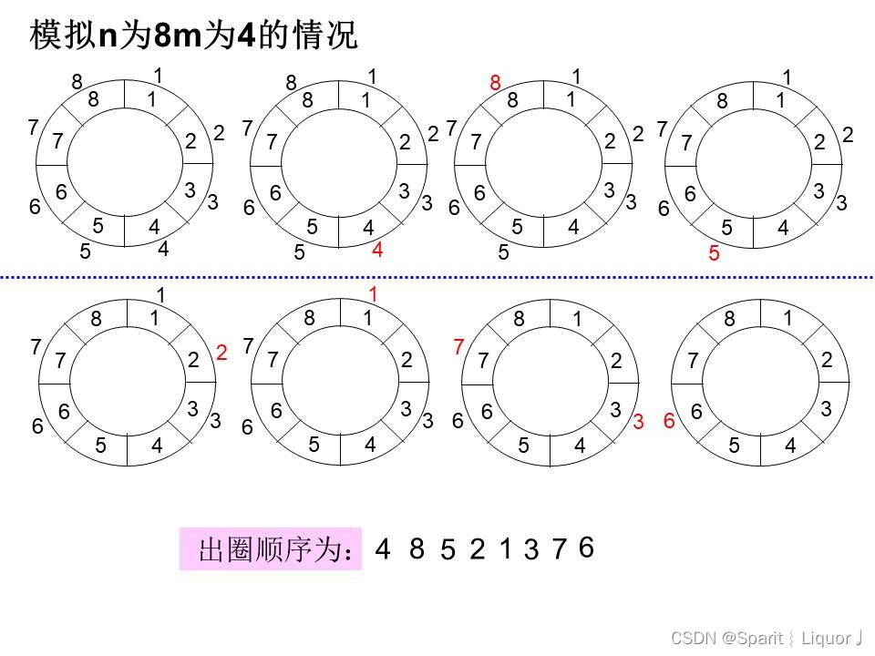 约瑟夫问题可以这样描述:n个人按1,2,3,… ,n编号,并顺序围坐一圈。开始按照1,2,3,… ,m 报数,凡报到 m 的出列。直到所有人出列为止。 下图模拟n为8m为4的出列顺序
