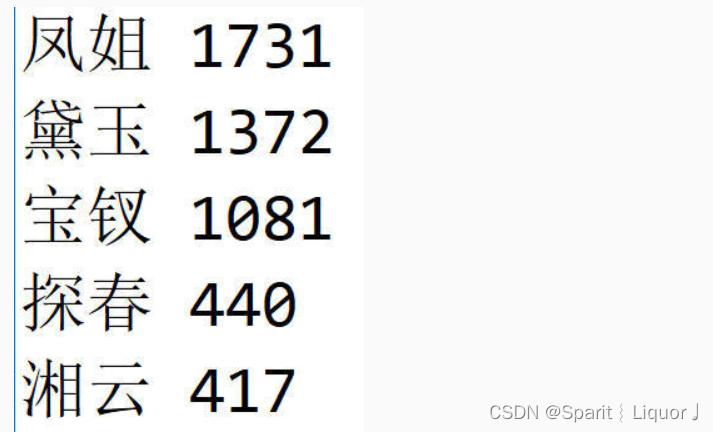 统计红楼梦.txt文件中十二金钗的出现次数并按从高到低的顺序显示出场次数最高的五位的姓名和出场次数