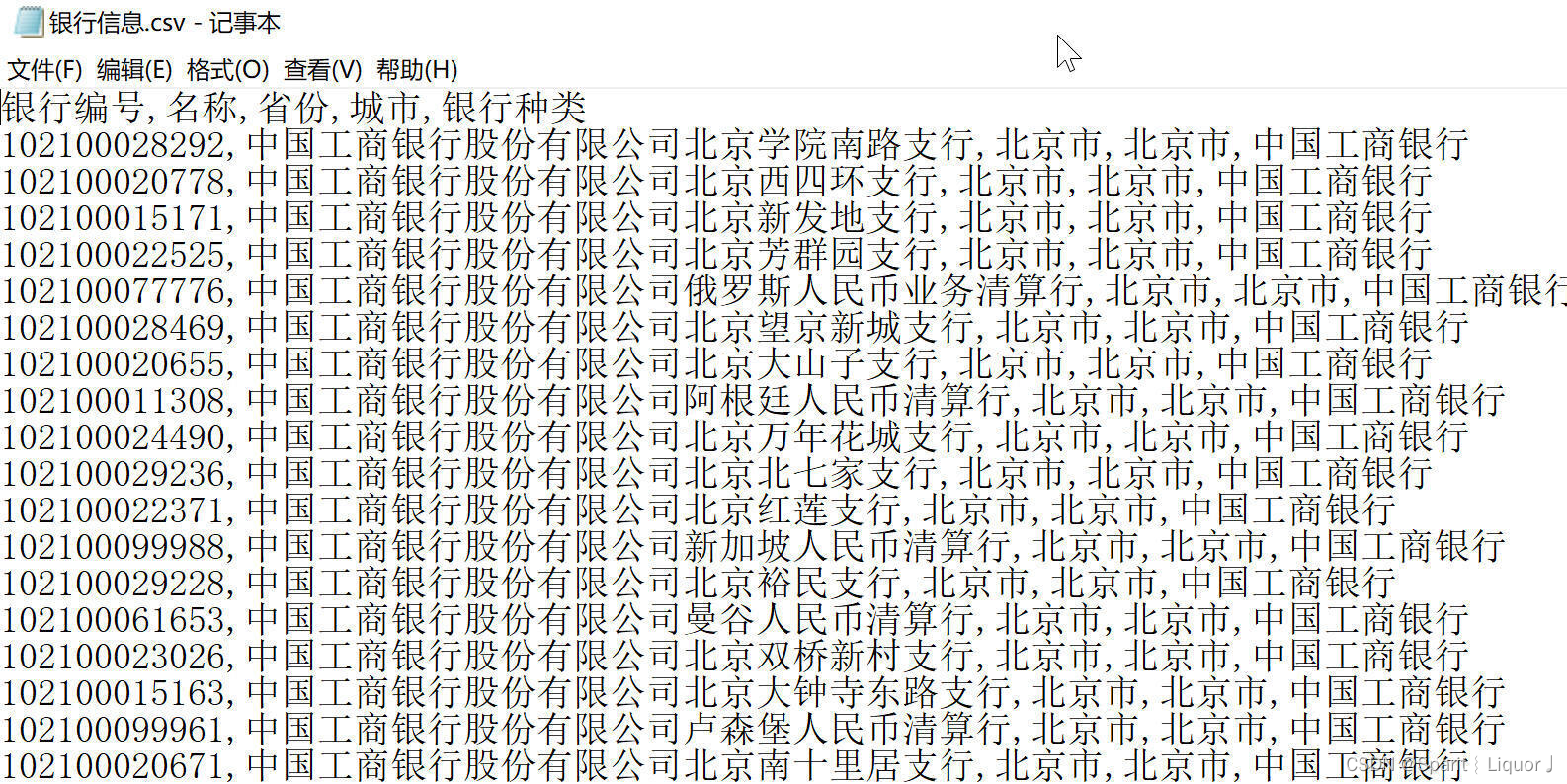 test文件夹的银行信息.csv如下所示:每行显示银行的编号,名称,省份,城市和类别信息。