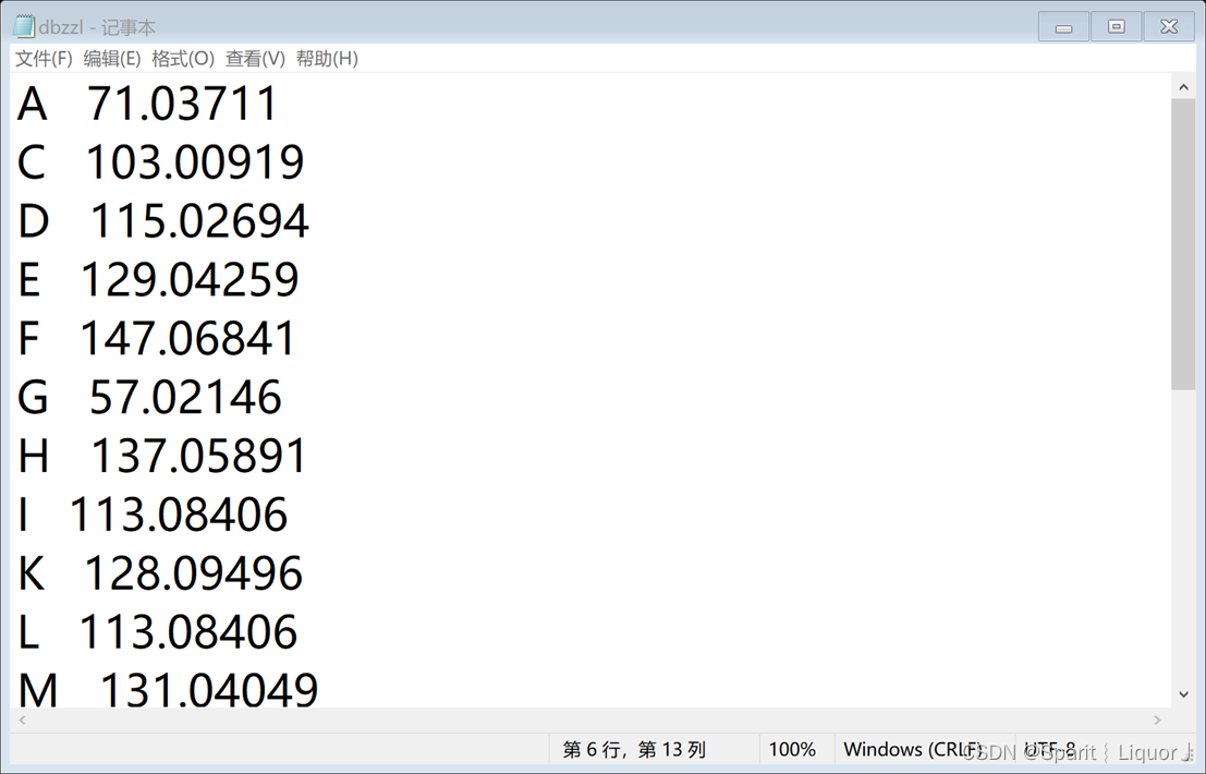 蛋白质质量的文件Dbzzl.txt如图所示,前面的字母表示蛋白质的种类,后面的数字表示蛋白质的质量 编写程序,输入一段蛋白质字符串,要求根据文件dbzzl.txt计算并显示该质量,要求精确到小数点后第3位。若输入的字符串中有其他字符,显示输入错误。 例如,输入SKADYEK,输出质量821.392 输入S!ADYEK,输出输入错误