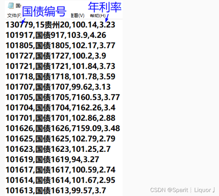 test文件夹的国债信息.csv中记录了国债的信息,如图所示,第一列为国债编号,第四列为年利率(需要除以100)