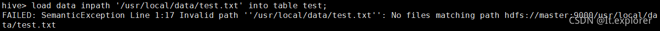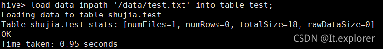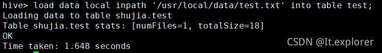 load data local inpath '/usr/local/data/test.txt' into table test;