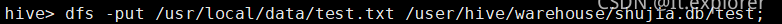 dfs -put /usr/local/data/test.txt /user/hive/warehouse/shujia.db/test;