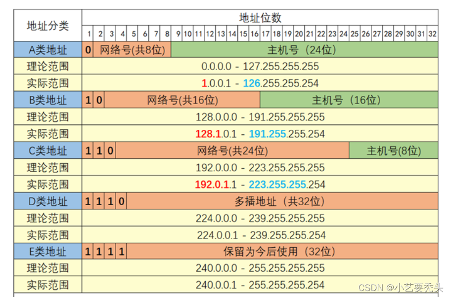 - 网络号二进制位全0表示本网络,故A类地址中的0(00000000)网络号不分配,A类地址会从网络号1(00000001)开始分配。而B,C类地址因为开头的二进制位已经固定含1,不可能出现二进制位全0的情况,所以不需要考虑上述问题。但作为保留地址,B类地址中的128.0和192.0.0网络号也不分配