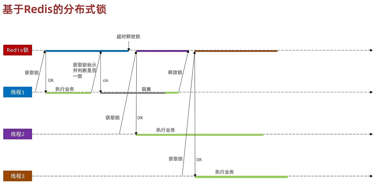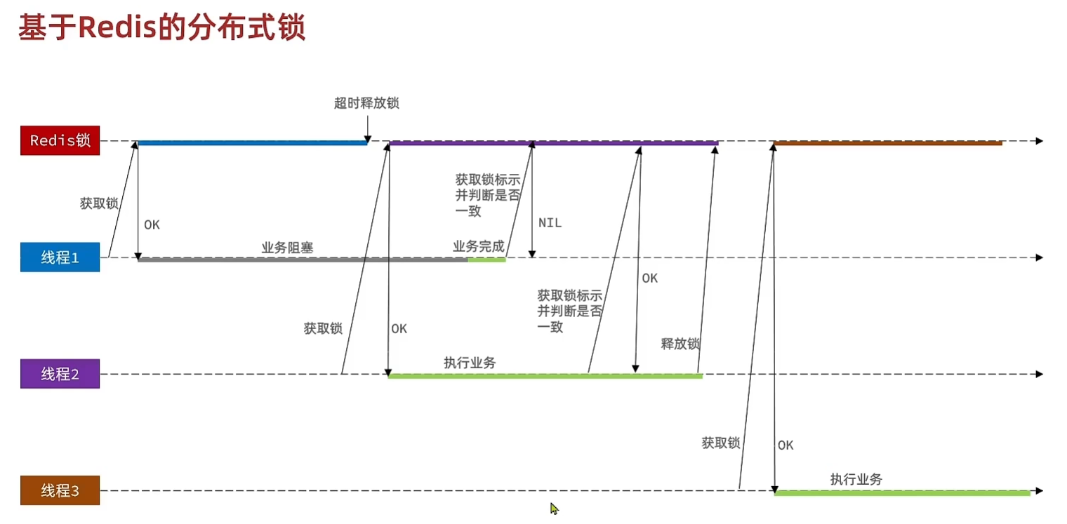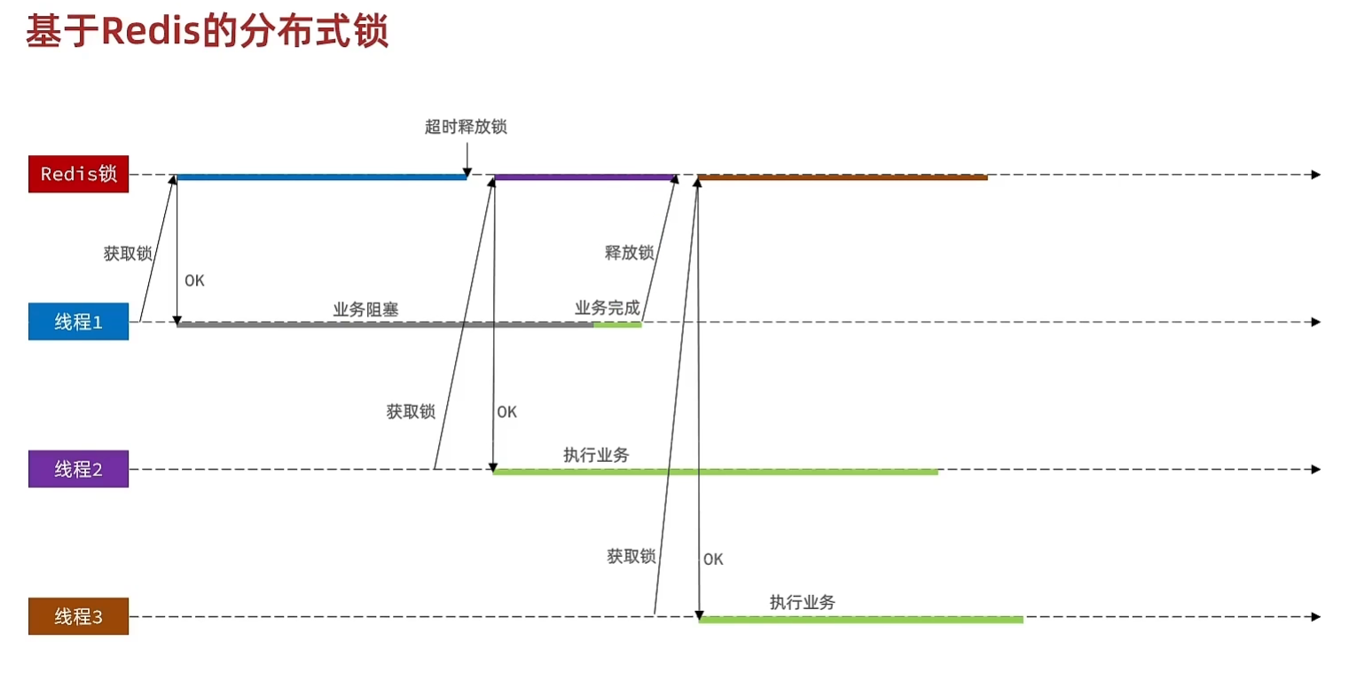 线程二尝试获取锁成功,执行业务。线程一业务完成,释放锁(del),线程二锁被释放。