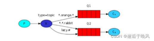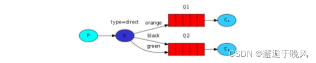 直连交换机x上绑定了两个队列。第一个队列绑定了绑定键orange,第二个队列有两个绑定踺:black和greeno在这种场景下,一个消息在指定了路由键为orange将会只被路由到队列QI,路由键为black和greeno的消息都将被路由到队列 Q2。其他的消息都将被丢失。