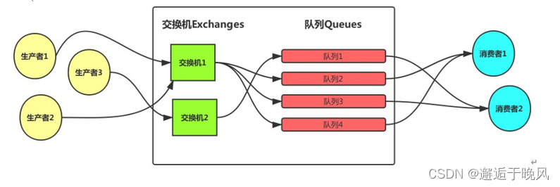 在RabbitMQ中,生产者发送消息不会直接将消息投递到队列中,而是先将消息投递到交换机中,在由交换机转发到具体的队列,队列再将消息以推送或者拉取方式给消费者进行消费