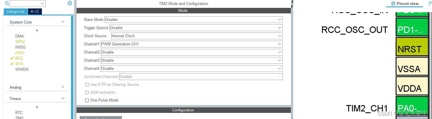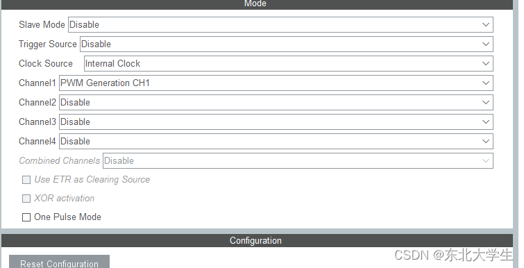 CubeMX进行基本配置定时器PWM实现 如下面两个PWM波形中,上图为采用PWM模式1,通道极性为高电平时产生的PWM波,下图为采用PWM模式2,通道极性为高时产生的PWM波;:可以选择模式1/模式2,这两种模式区别为生成的PWM波形不一样,选择PWM模式1且向上计数时,当Pulse值