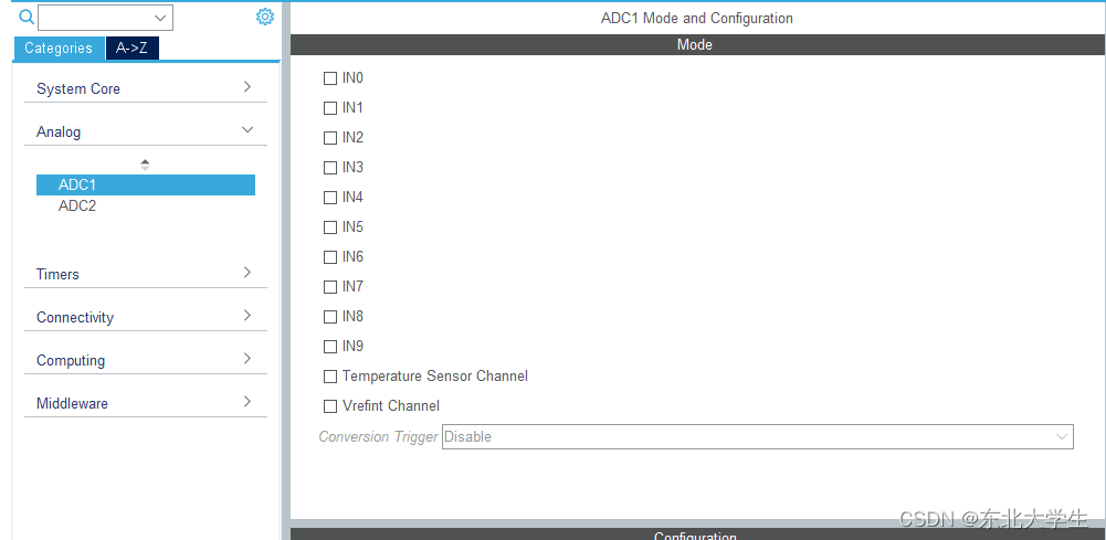 STM32中ADC在cubemx基础配置界面介绍 一般情况下不需要使用注入通道,可以将注入通道认为是ADC中断,即打断规则通道的采样进程执行注入通道的采样。Timer X Trigger Out event 定时器通道输出触发 需要设置相应的定时器设置。Timer X Trigger Out event 定时器通道输出触发 需要设置相应的定时器设置。#当有多个通道需要采集信号时必须开启扫描模式,此时ADC将会按设定的顺序轮流采集各通道信号。单次转换模式ADC只采集一次数据就停止采集,使用单次转换模式需要转换通道数大于1。