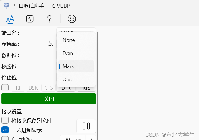 UART串口校验方式(无校验、奇偶校验) 串口通信过程中有五种校验方式:奇校验(ODD)、偶校验(EVEN),1校验(MARK) 、 无校验(NONE)。奇校验(ODD):如果字符数据位中"1"的数目是偶数,校验位为"1",如果"1"的数目是奇数,校验位应为"0"。偶校验(EVEN):如果字符数据位中"1"的数目是偶数,则校验位应为"0",如果是奇数则为"1"。(校验位调整个数)无校验(NONE): 没有校验位。1校验(MARK):校验位总为1。