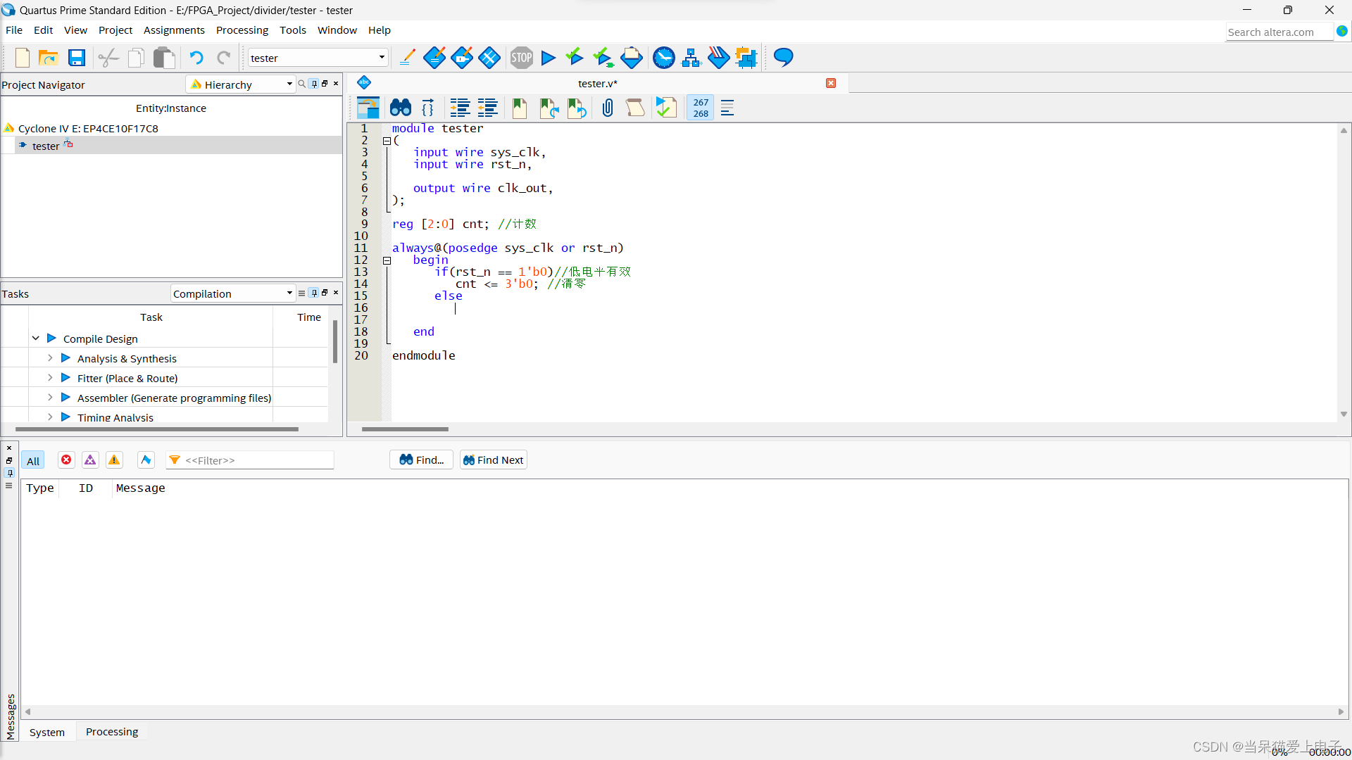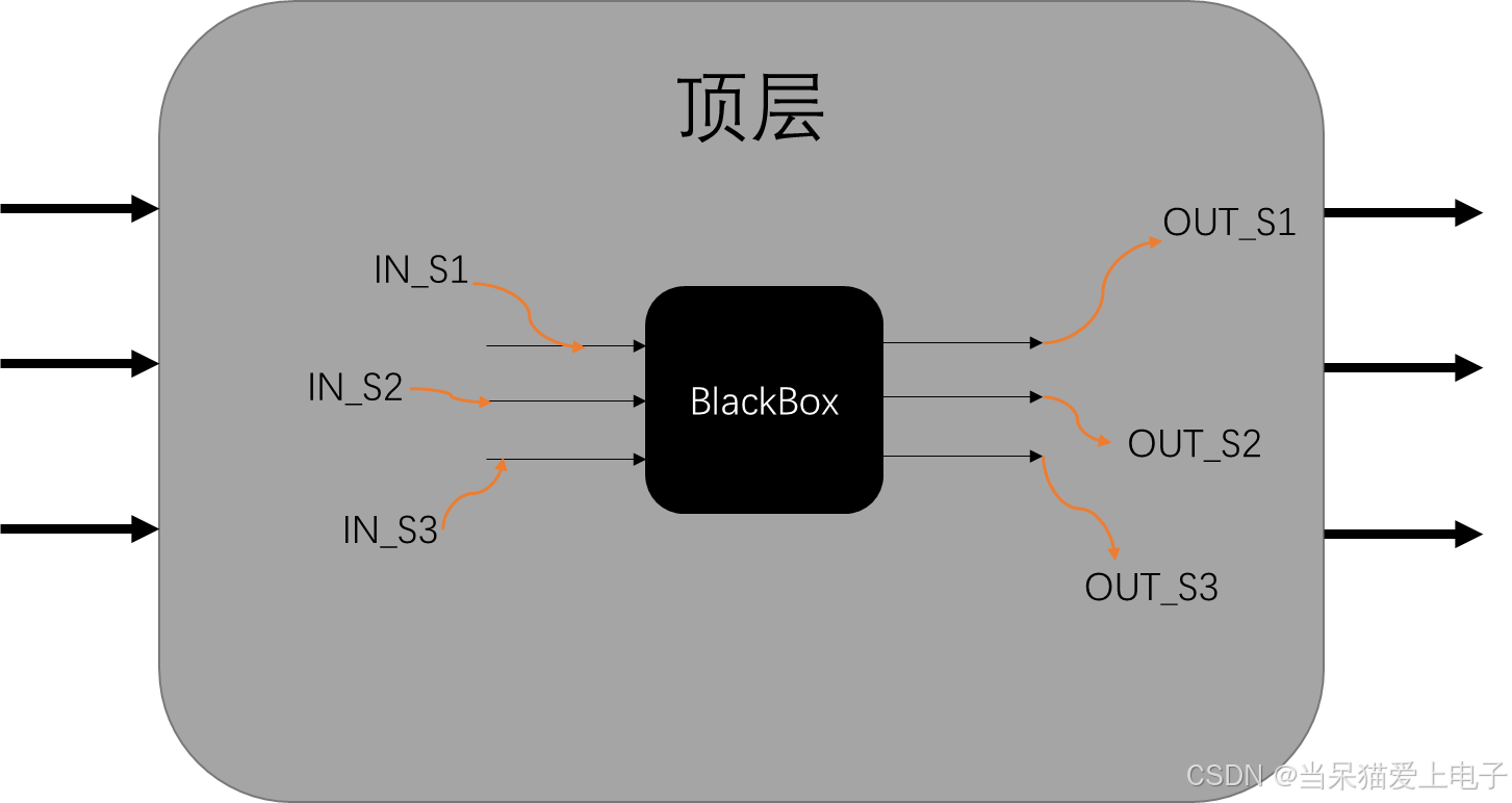 而对于黑盒子(例化元件)的输出而言,这个黑盒子已经对顶层中传入的信号进行处理并输出,想要应用的黑盒子的输出信号,需要直接用wire类型的变量(可以想象成线)将其引出供顶层模块使用,因此,对于黑盒子的输出信号,只能使用顶层模块中的wire变量连接。当我们需要在顶层模块中调用子模块时,需进行例化操作,即利用已经写好的module来生成一个模块供顶层模块调用(相当于黑盒子)。然而,在顶层调用时,需将黑盒子的输入、输出引脚连接至顶层模块中去,这时在顶层模块中,传入到黑盒子的输入输出引脚的变量类型是怎样的呢?