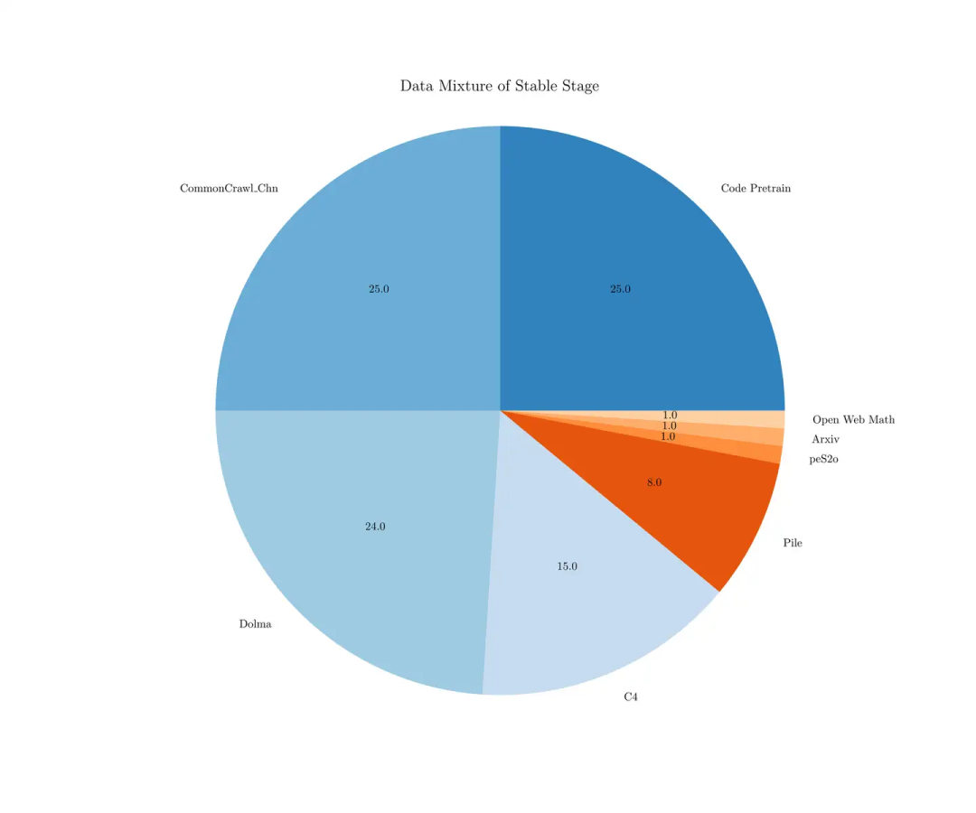 Scaling Law实验确定数据配比:基于同一个数据配比,训练若干个不同的小模型(从40M到16B),观察其scaling曲线。(我猜是人工设置的配比候选),最终结构:50%通用、25%数学以及推理、17%代码、8%多语。最终通用是什么样子也不清楚