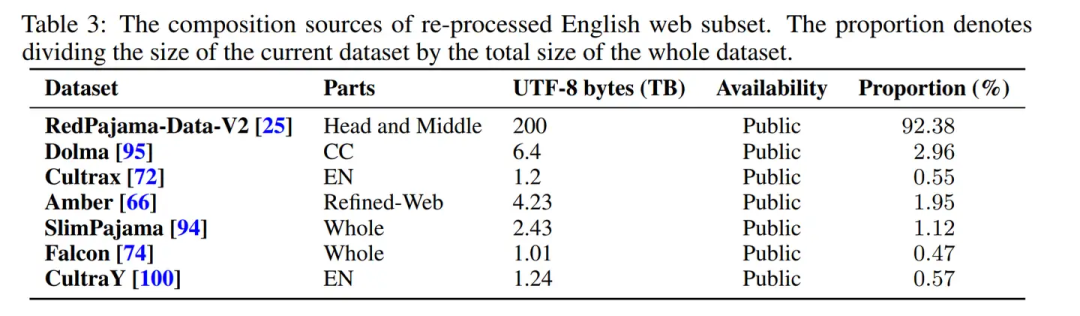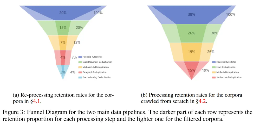 这里仍然没有对数据配比进行系统性的调研,解释清楚为什么RedPajama要占92.38%。一些数据过滤、去重的Pipeline与Qwen和LLAMA也非常相似,就不展开叙述了。下图为各个处理组件过滤后,剩余的数据量。