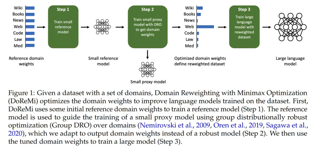 Google DeepMind的工作,先不使用任何下游任务知识的情况下,训练一个小的代理模型(280M),得到数据配比。随后利用该数据配比,训练真正的大模型(8B)。