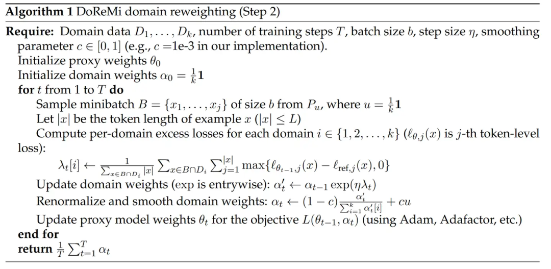 使用基于在线学习的方式进行训练,在每个domain上的动态更新数据混比。根据每个domain部分的loss情况,来选择重新调整数据配比,使其优化超额损失。对超额损失大的domain的一个Batch,计算各个数据项的超额损失求和\lambda,e^(n\lambda)*原domain配比作为新domain配比。随后更新基线模型和代理模型权重。