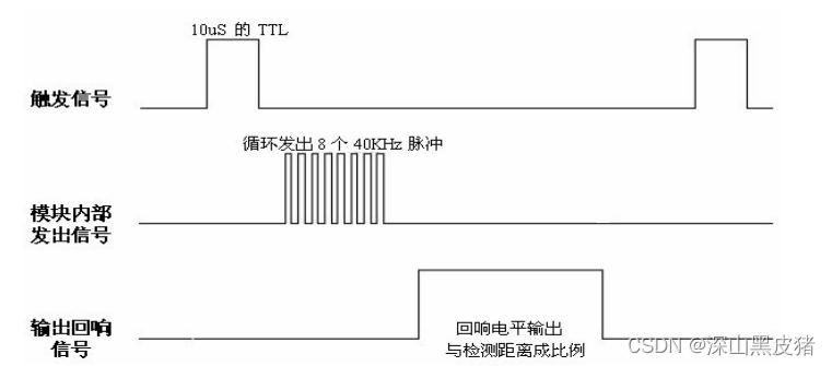 以上时序图表明你只需要提供一个 10uS 以上脉冲触发信号,该模块内部将发出 8 个 40kHz 周期电平并检测回波。一旦检测到有回波信号则输出回响信号。回响信号的脉冲宽度与所测的距离成正比。由此通过发射信号到收到的回响信号时间间隔可以计算得到距离。公式: uS/58-厘米或者 uS/148=英寸;或是:距离高电平时间*声速(340M/S) /2:建议测量周期为 60ms 以上,以防止发射信号对回响信号的影响。