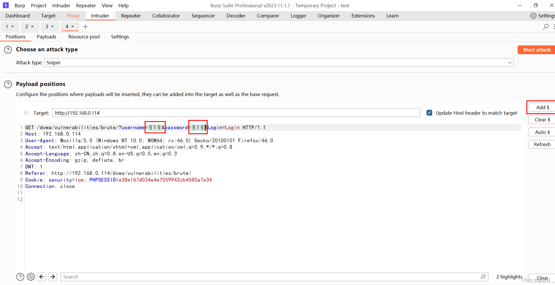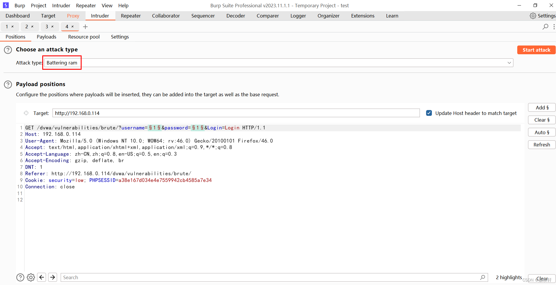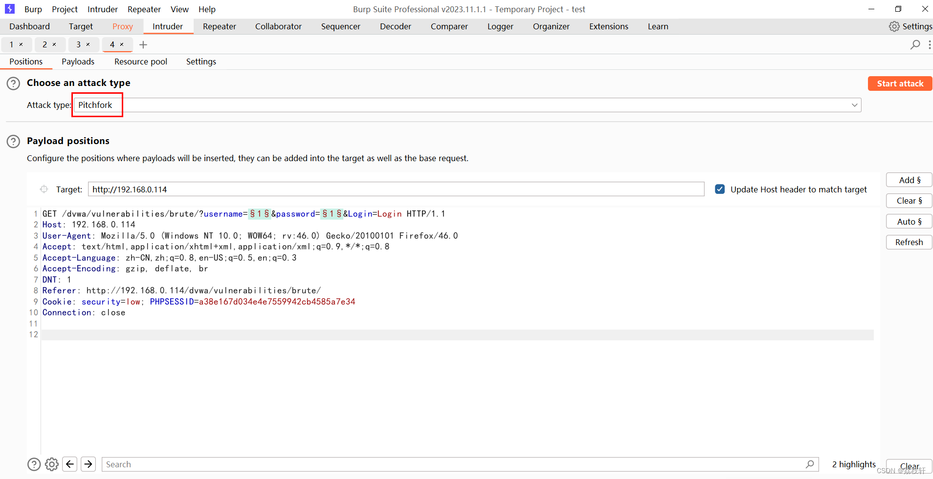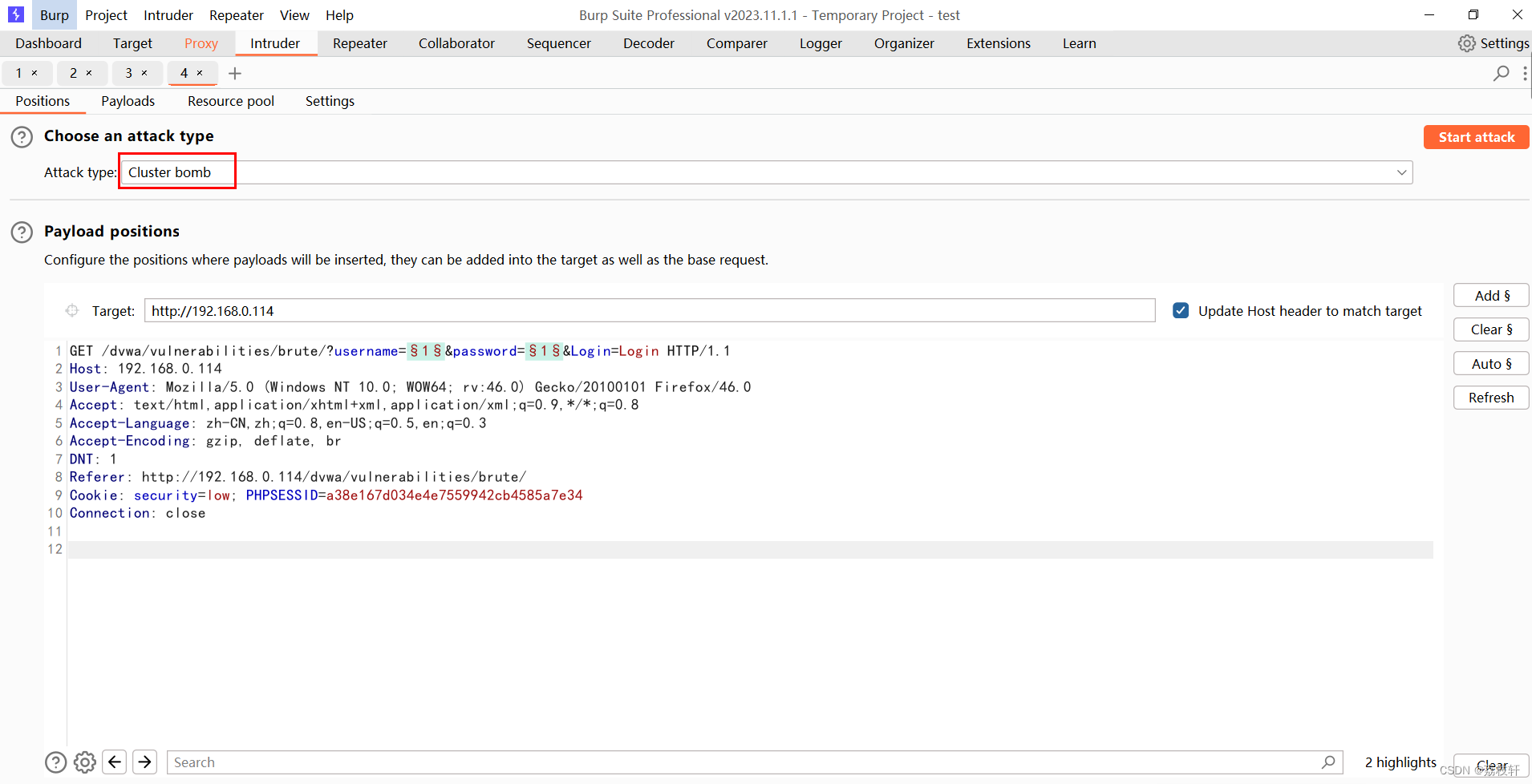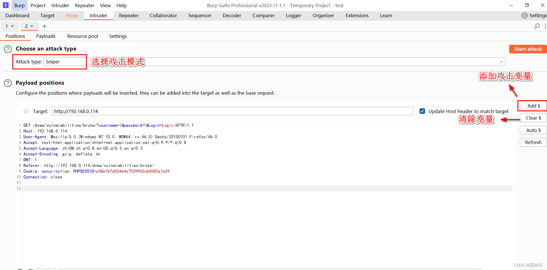 2:Positions 设置Payloads的插入点以及攻击类型(攻击模式)。