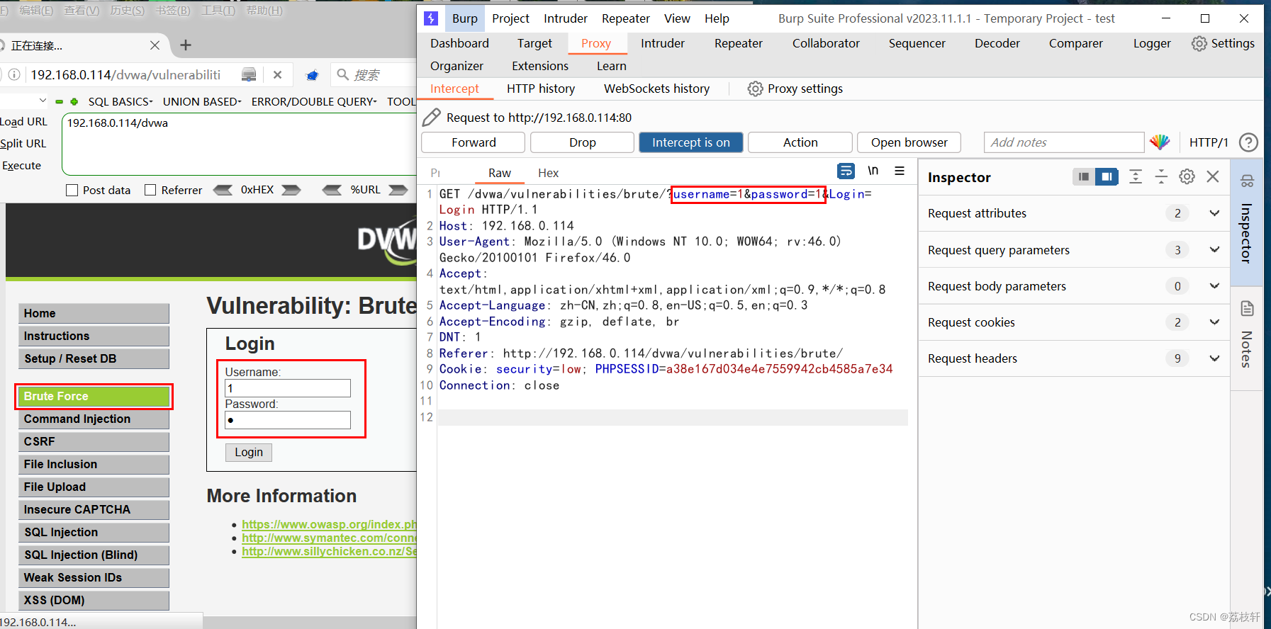 第一步:打开DVWA靶场爆破模式,并且将难度调整为低