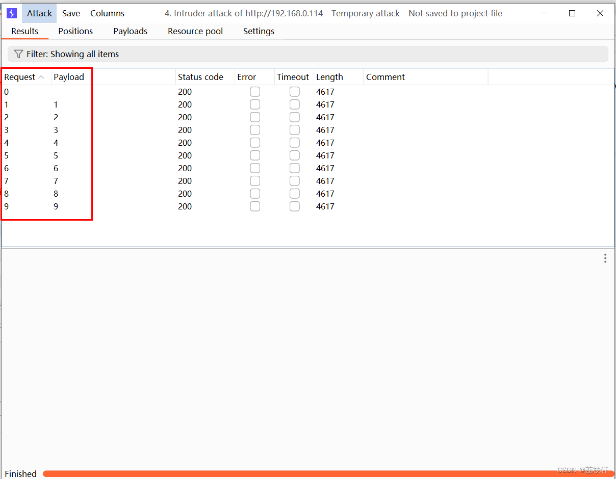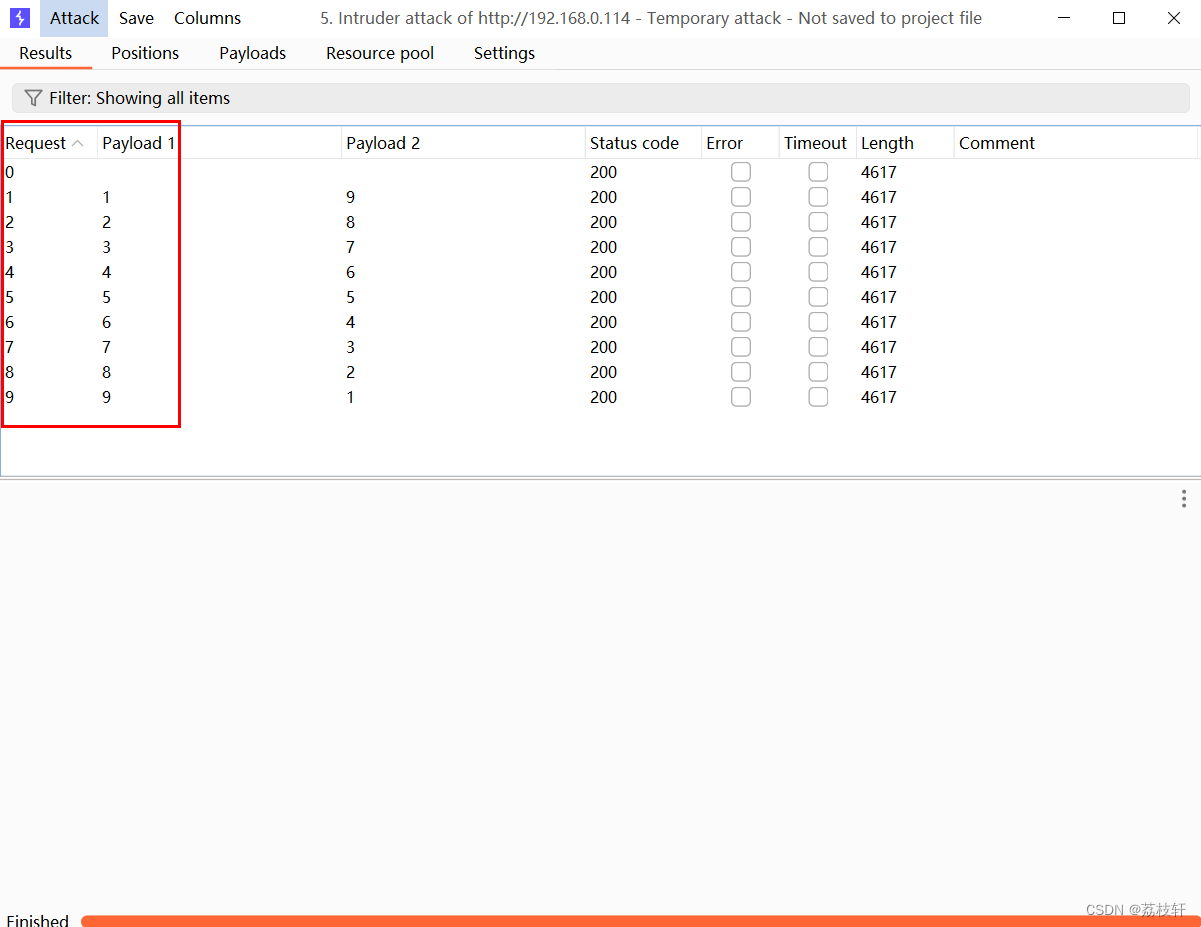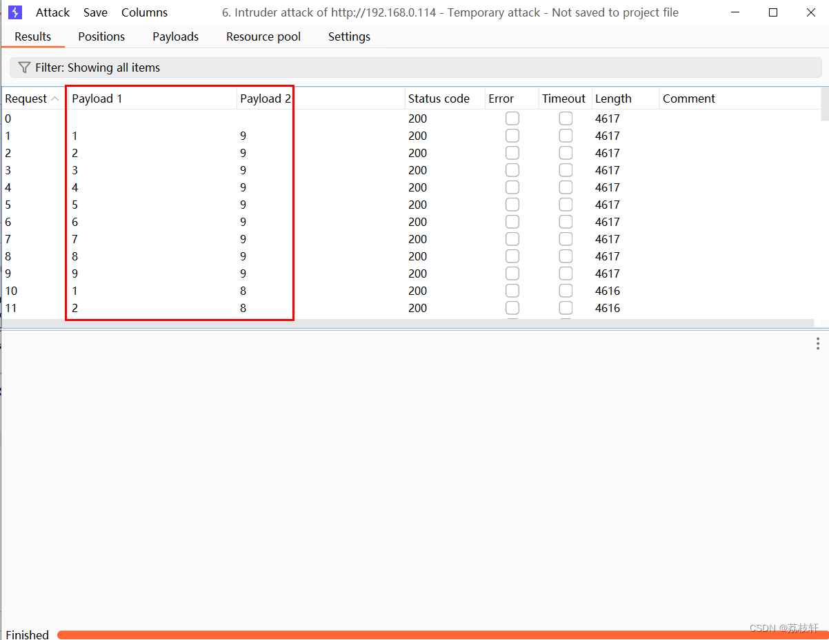 第四步:观察攻击结果,发现两个变量处使用同一个字典进行爆破(密码账号爆破内容一样)