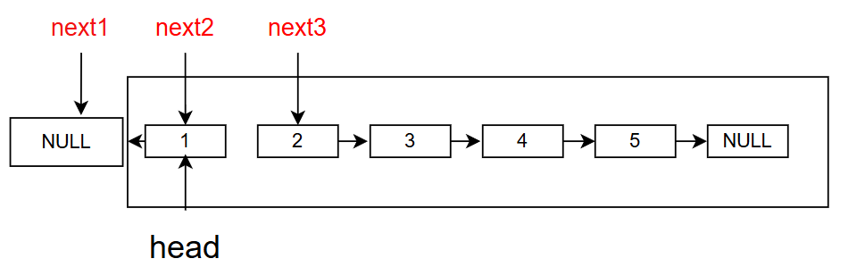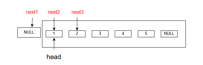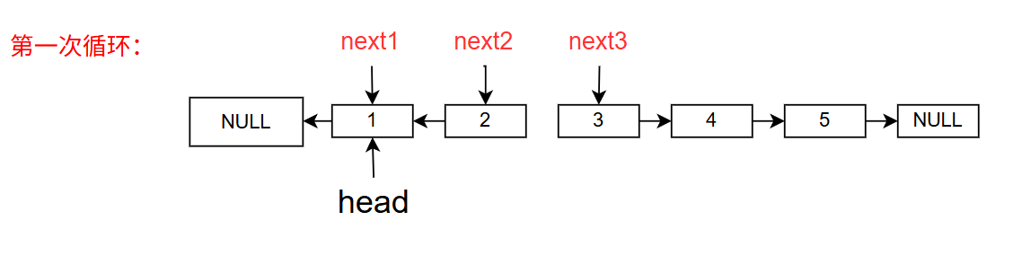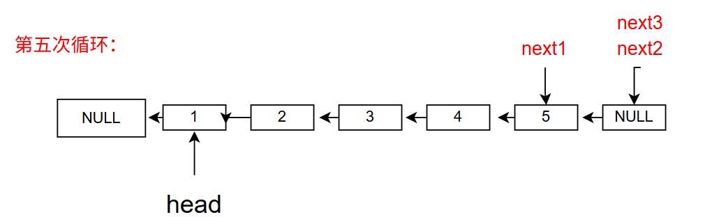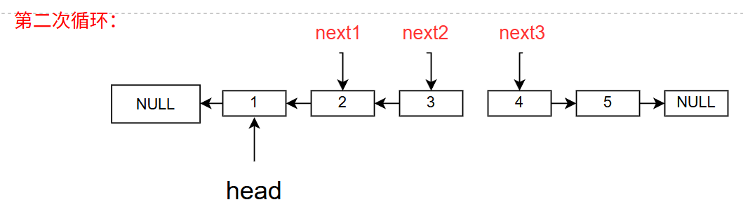 next2(当前节点)为NULL时停止,此时next1指向反转后的头节点