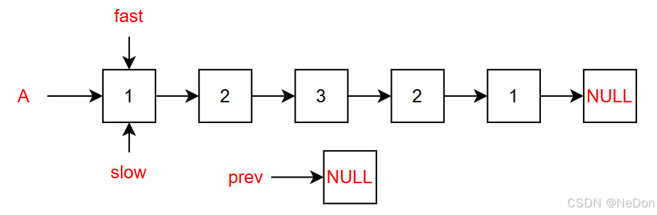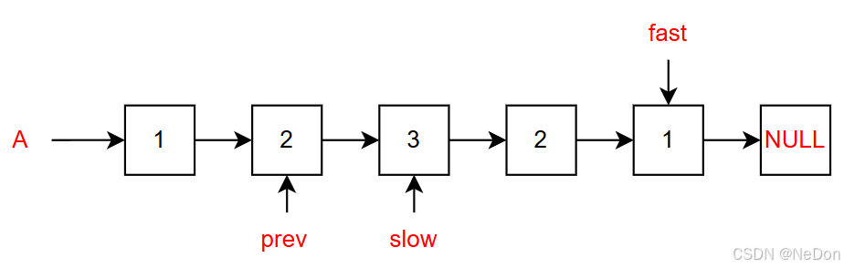 fast指针每次向后走两步,slow指针每次往后走一步,当fast指针到达最后一个节点或者NULL到达NULL时,slow正好落于链表的中间节点,prev指针指向前链表的末端。