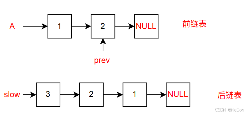 prev = 节点2,正好是前链表的最后一个节点,需要将其next指向NULL;