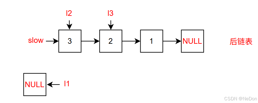 这里为了避免更改原链表头指针,我们可以将slow指针重新指向后一个链表的头节点,然后创建一个指针指向前链表的头节点。