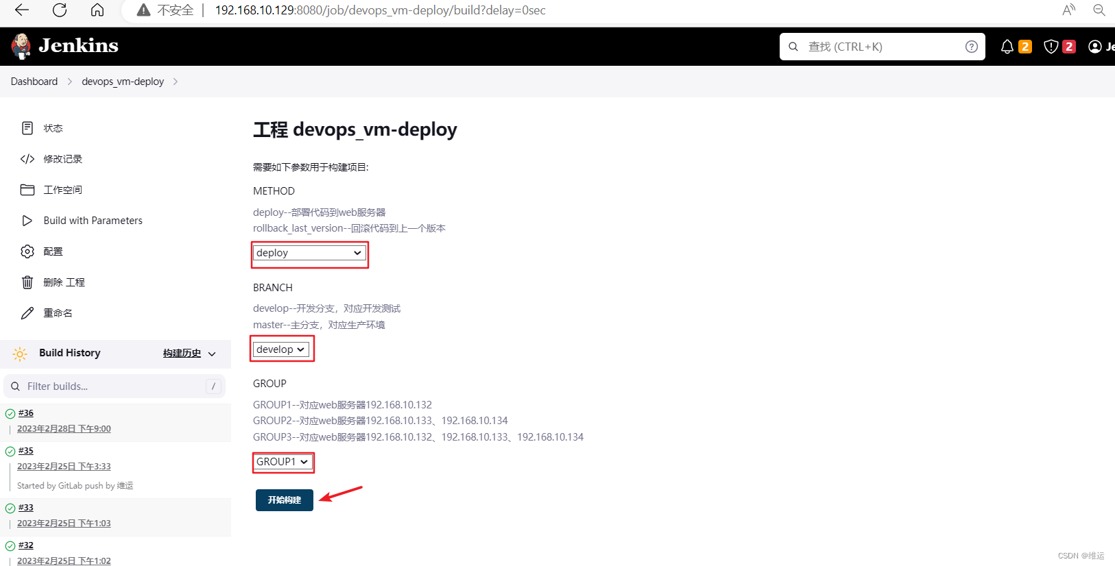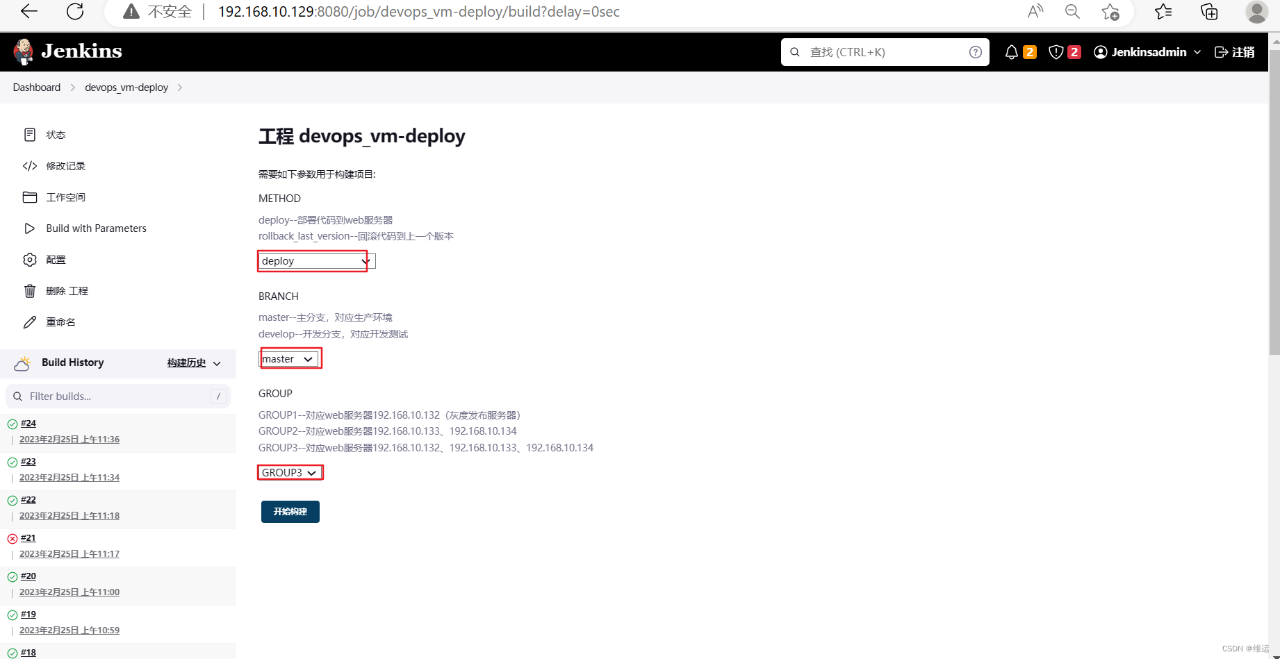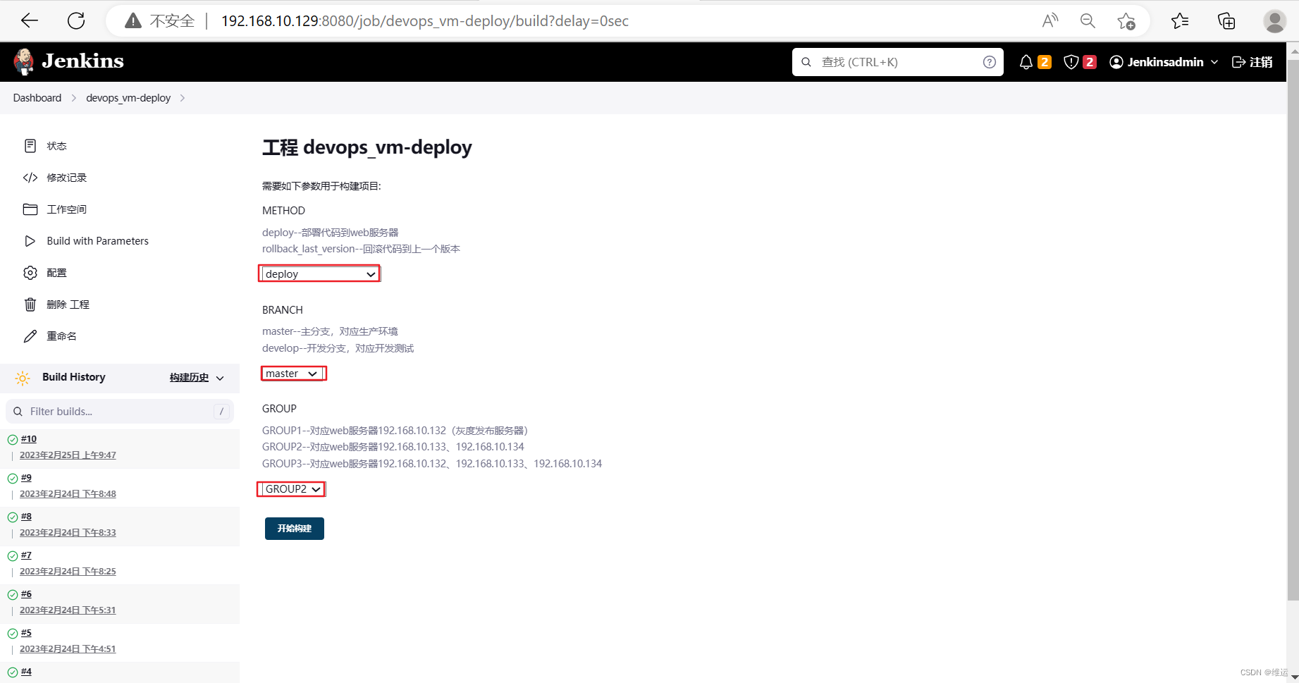 #再查看web服务器,有一部分服务器部署成功,Jenkins项目默认参数是第一个,所以是deplay(部署),develop(分支),GROUP1(192.168.10.132web服务器),如果新版本的web服务器没有什么问题,然后分支集成到主干,再去手工部署其他的web服务器。