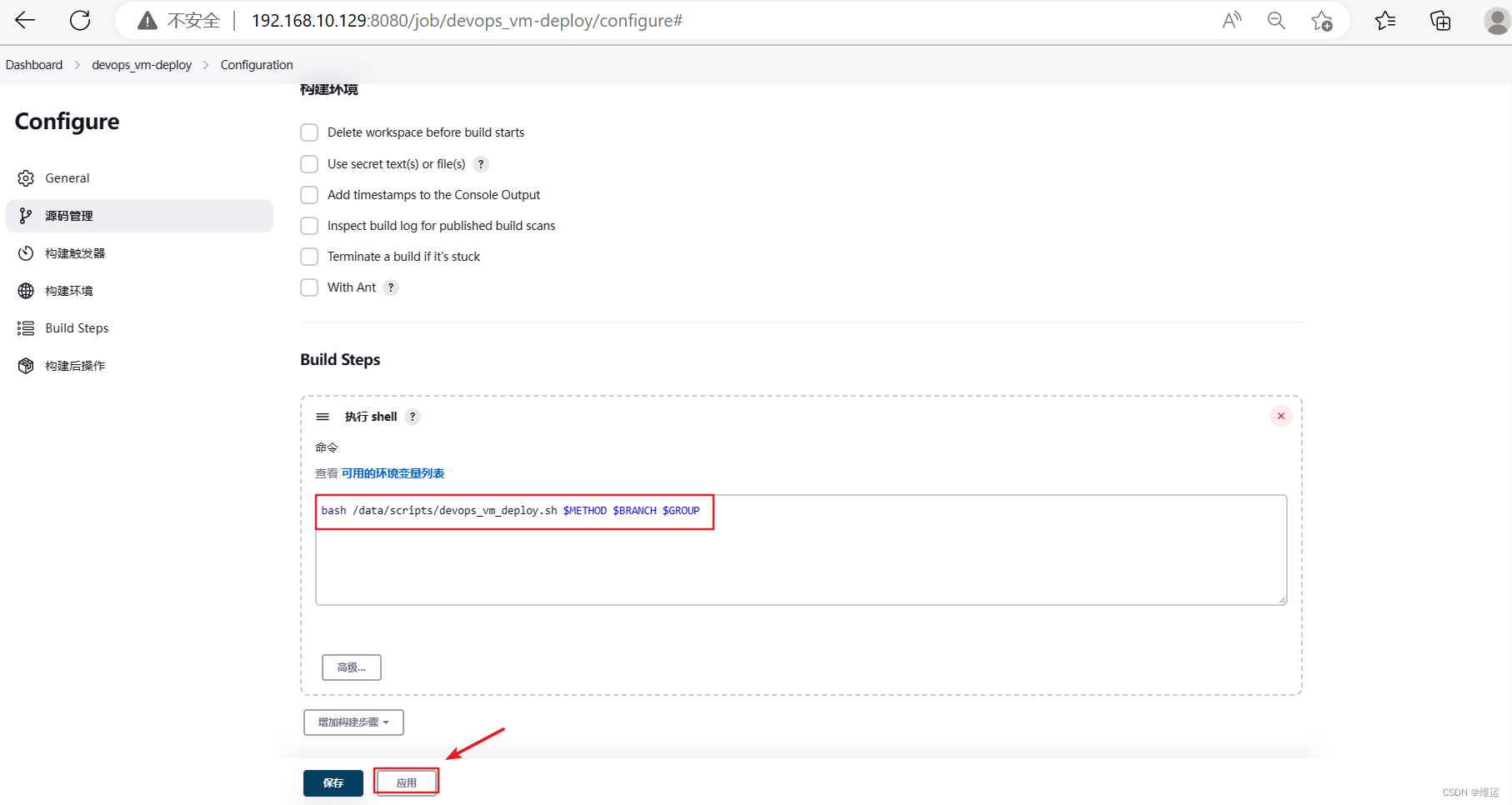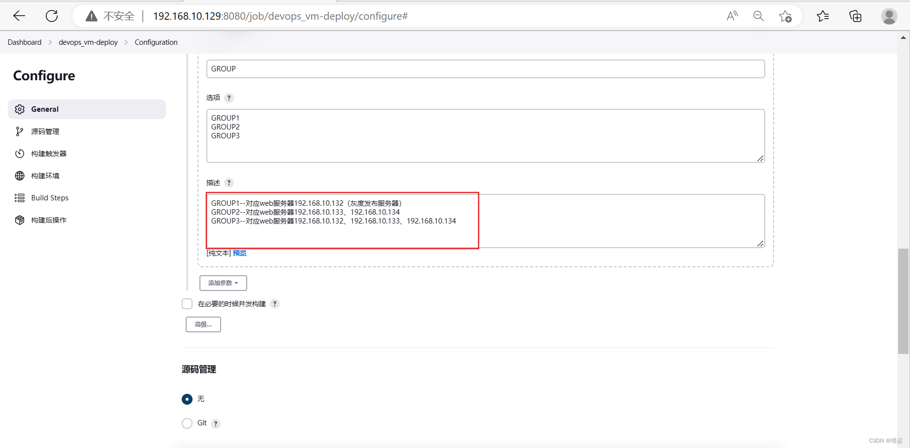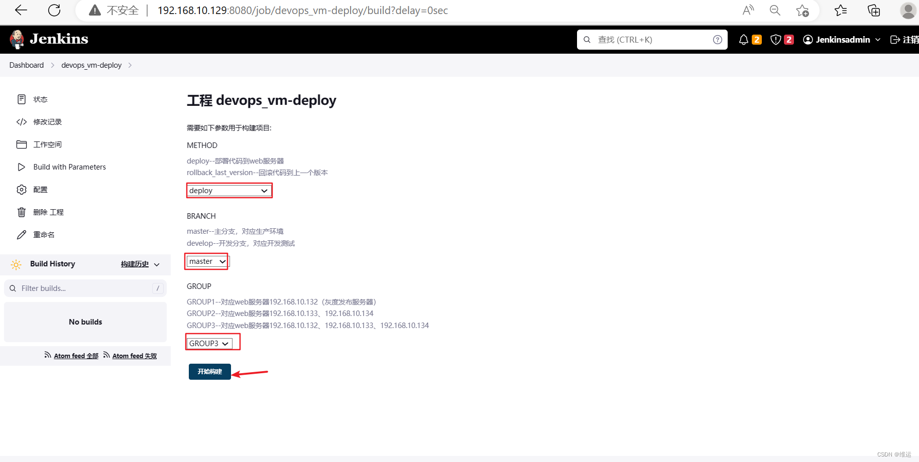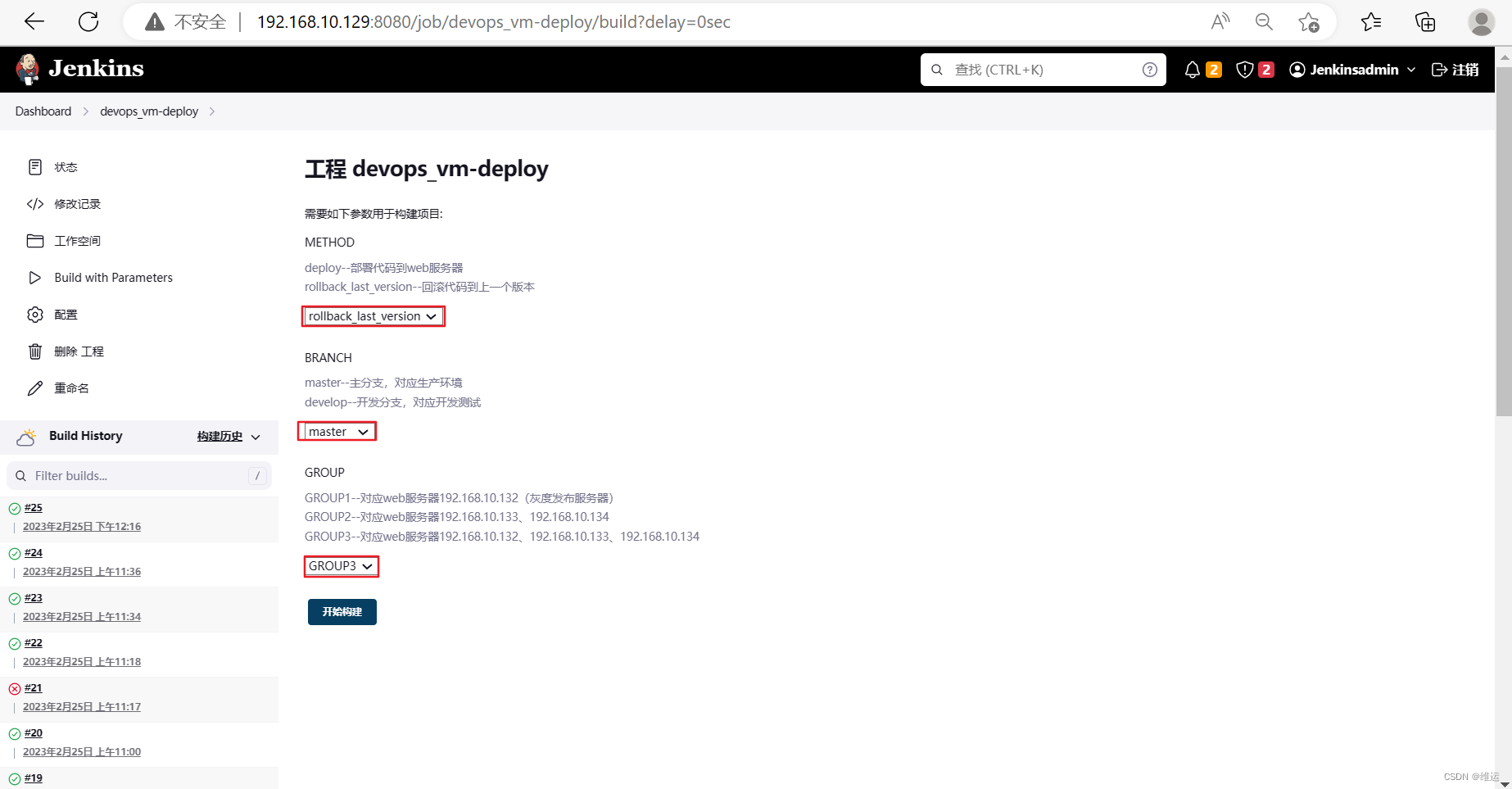 #再查看web服务器,有一部分服务器部署成功,Jenkins项目默认参数是第一个,所以是deplay(部署),develop(分支),GROUP1(192.168.10.132web服务器),如果新版本的web服务器没有什么问题,然后分支集成到主干,再去手工部署其他的web服务器。