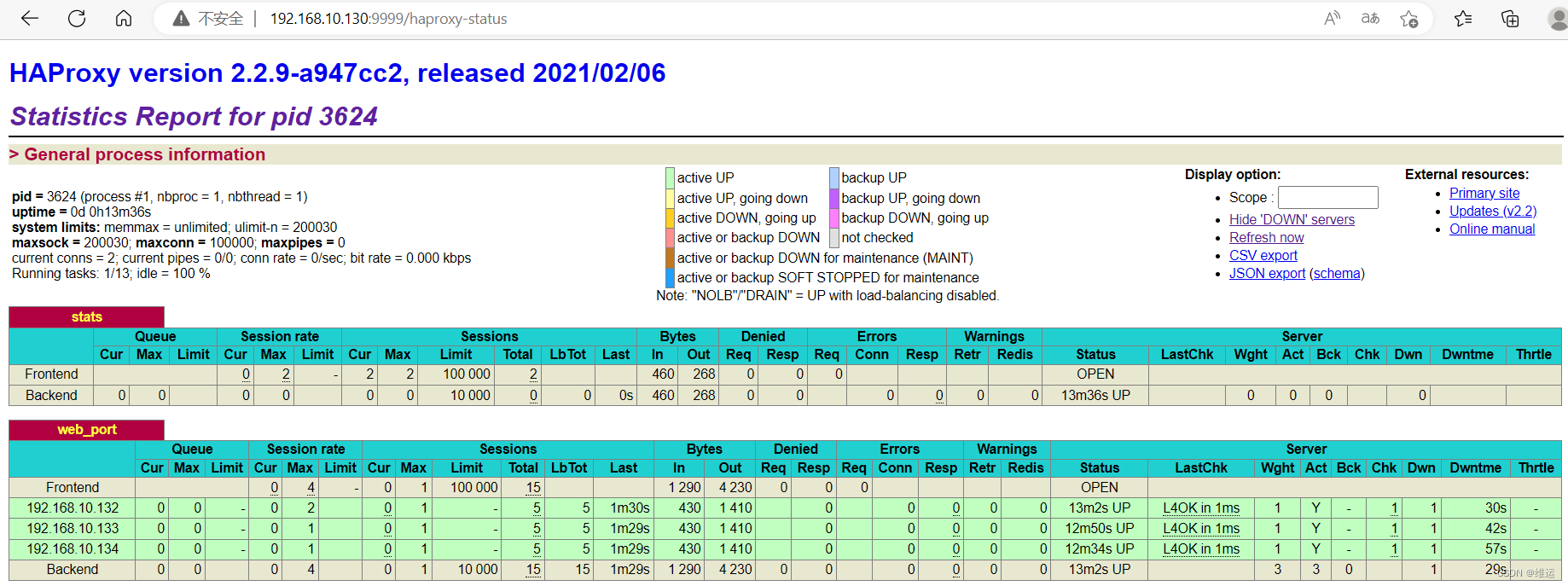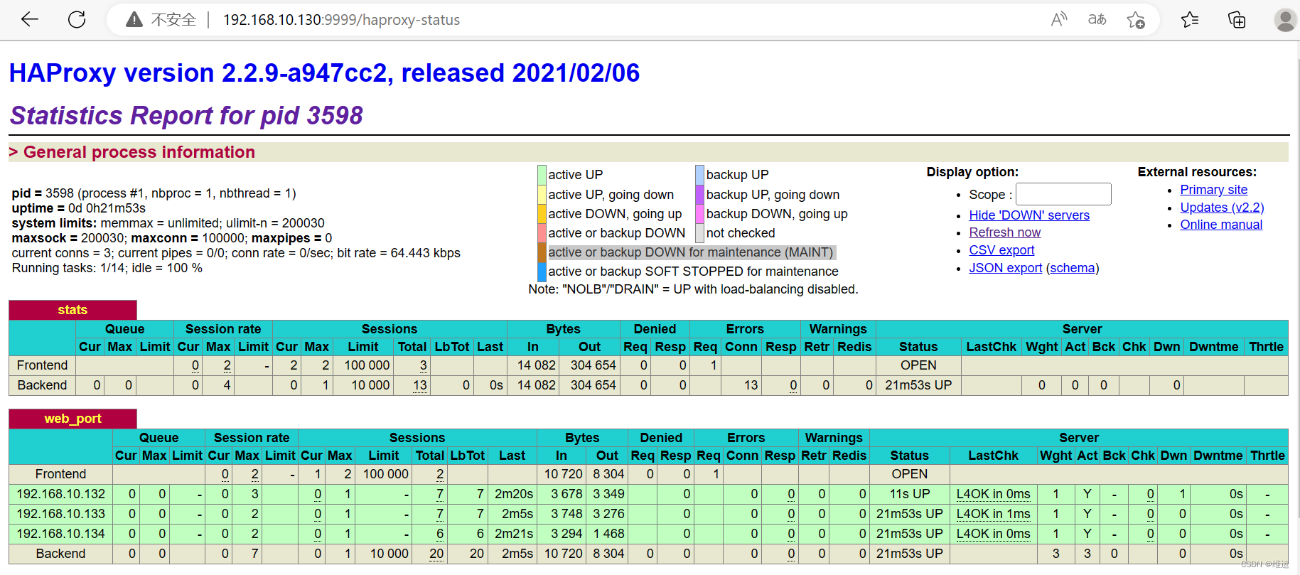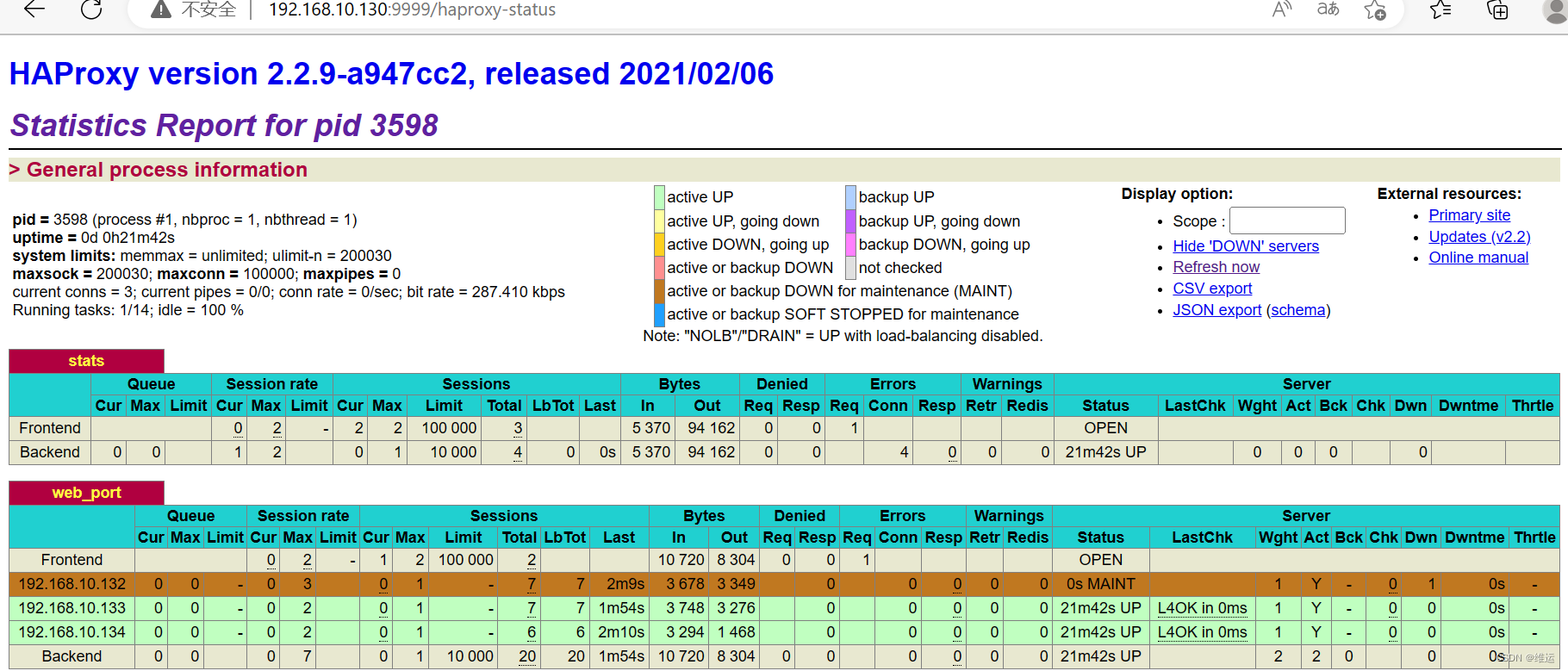 #haproxy的web页面查看,会先停用192.168.10.132这个web服务器,颜色会变成棕色,此时用户访问的只有其他两个web服务器,等132这个web服务器升级之后,就会变为绿色,此时有一部分用户访问的新版本的内容