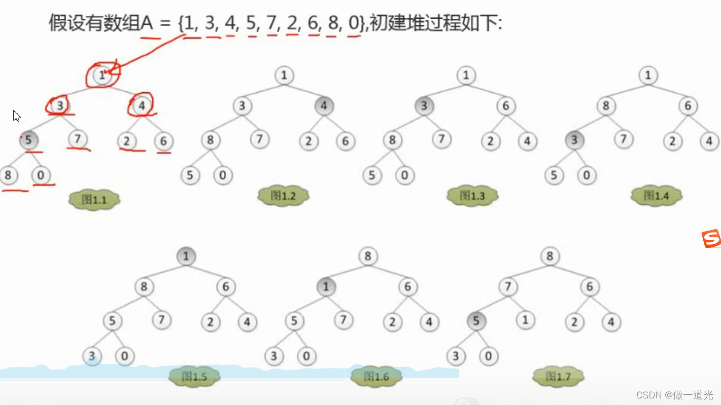 大顶堆:将数组元素依次写下,从左边第一个非叶子结点开始比较,对元素的一个子树的三个元素进行比较,选取三个元素中,最大的一个元素充当第一个非叶子结点。