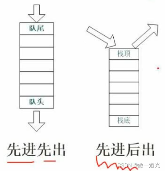 左边的队列是先进后出用法,右边的队列是先进先出用法。