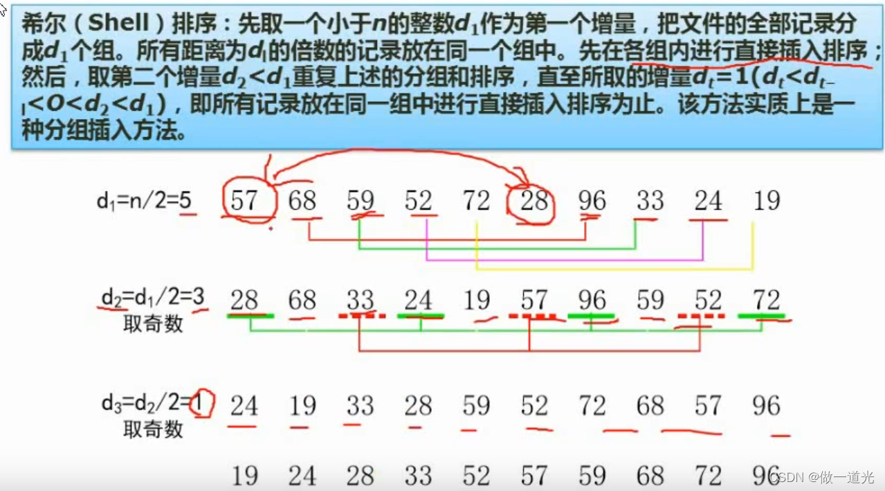分成不同的组,不同的组之间依次比较,同一个组中的数进行排序,然后把这个组不断扩大,不断进行同一个组内的数据比较排序。