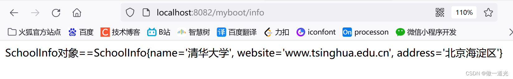 return name+",site="+site+",项目的访问地址="+contextPath+",使用的端口="+port;