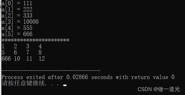 二维数组也是连续开辟空间,访问元素是行和列都是从0开始,分别是a[0][0] a[0][1] a[0][2] a[0][3] a[1][0] a[1][1] a[1][2] a[1][3]