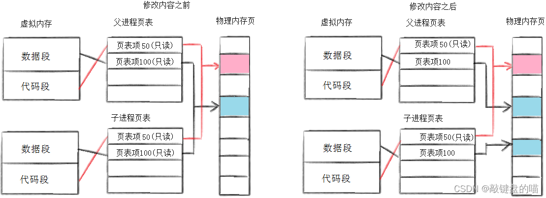 通常,父子代码共享,父子再不写入时,数据也是共享的,当任意一方试图写入,便以写时拷贝的方式各自一份副本。