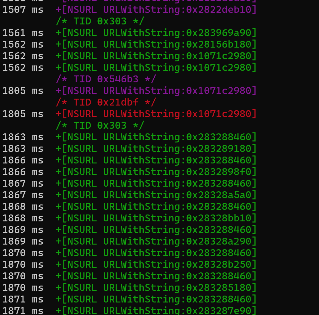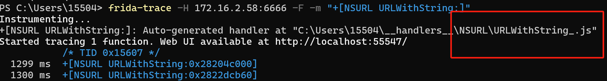 frida-trace -H 127.0.0.58:6666 -F -m "+[NSURL URLWithString:]"