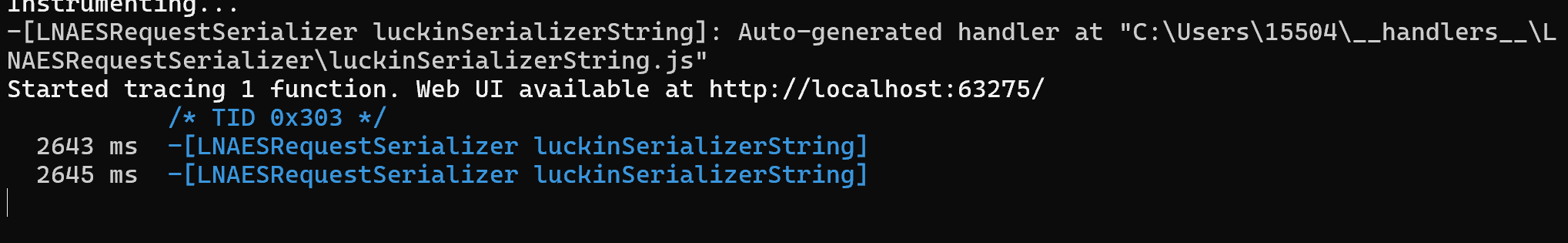 frida-trace -H 172.16.2.58:6666 -F -m "-[LNAESRequestSerializer luckinSerializerString]"