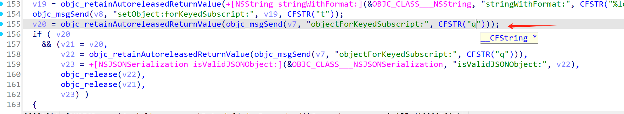 objc_msgSend(v8, "setObject:forKeyedSubscript:", v32, CFSTR("q")); // v32是处理后的q,存入v8
