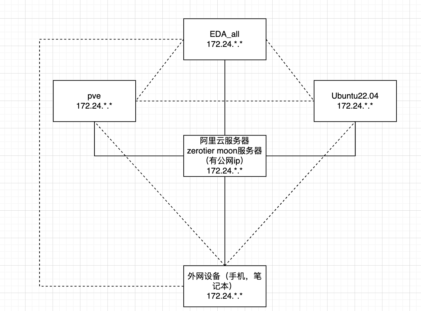 虚线代表可 P2P 打洞连接(速度更快); 最坏情况下会走阿里云服务器中继。 限制是子网最多 10 台设备,每次新增设备都要手动批准,略显麻烦。