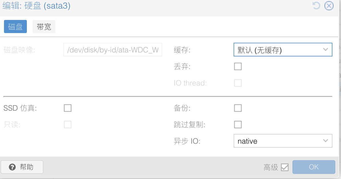 这样虚拟机就可以直接访问物理硬盘。 但注意:NAS 系统若存放大量照片,频繁访问可能造成 IO 堵塞,甚至导致宿主机宕机。 建议在 PVE GUI 中限制 I/O 带宽。
