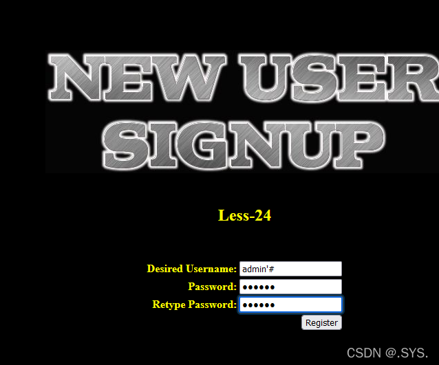 进入sqli-less-24注册新用户,用户名为 admin'#,密码为123456