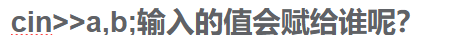 cin>>a,b;输入的值会赋给谁呢?运算符的优先级问题 对如下代码int a =1;int b=2;cin>>a,b;cout<<a<<endl;cout<<b<<endl;倘若输入10,则输出结果是什么?这就涉及到运算符优先级的问题了。"<<"是流提取运算符,由于“<<”的运算级高于“ , ”,故计算机先运行cin<<a,运行完这步后剩下了“,b”,不能给b进行赋值,故10赋给了a,而b的值没有变化。要注意的是,以上例...