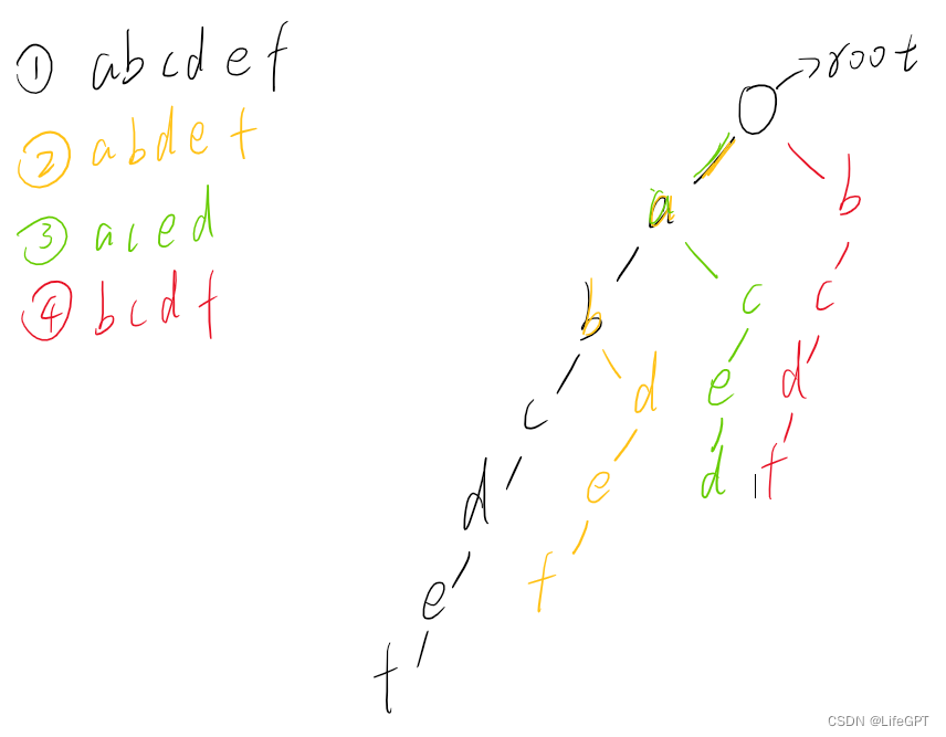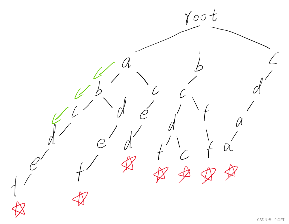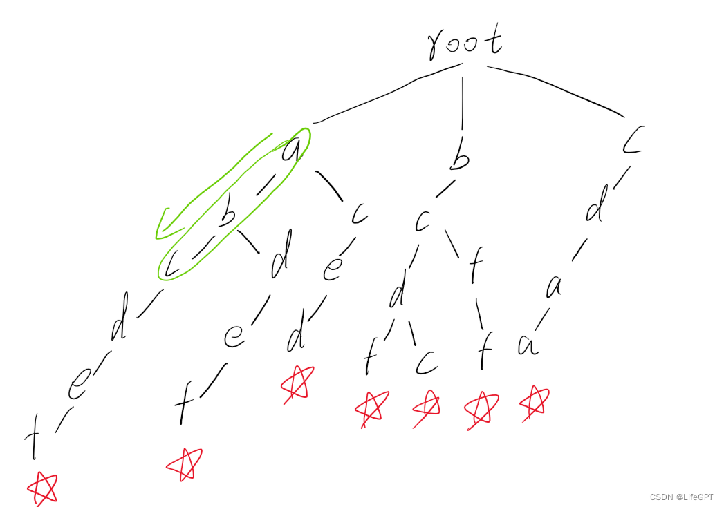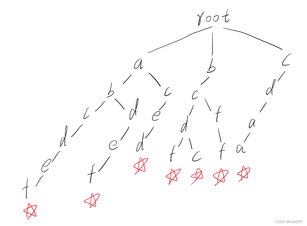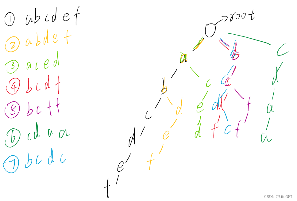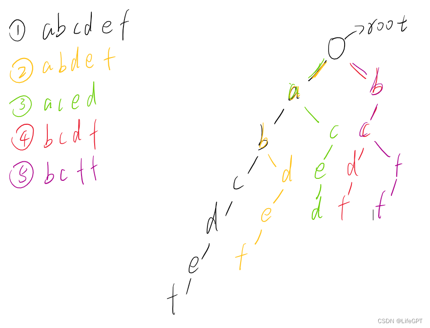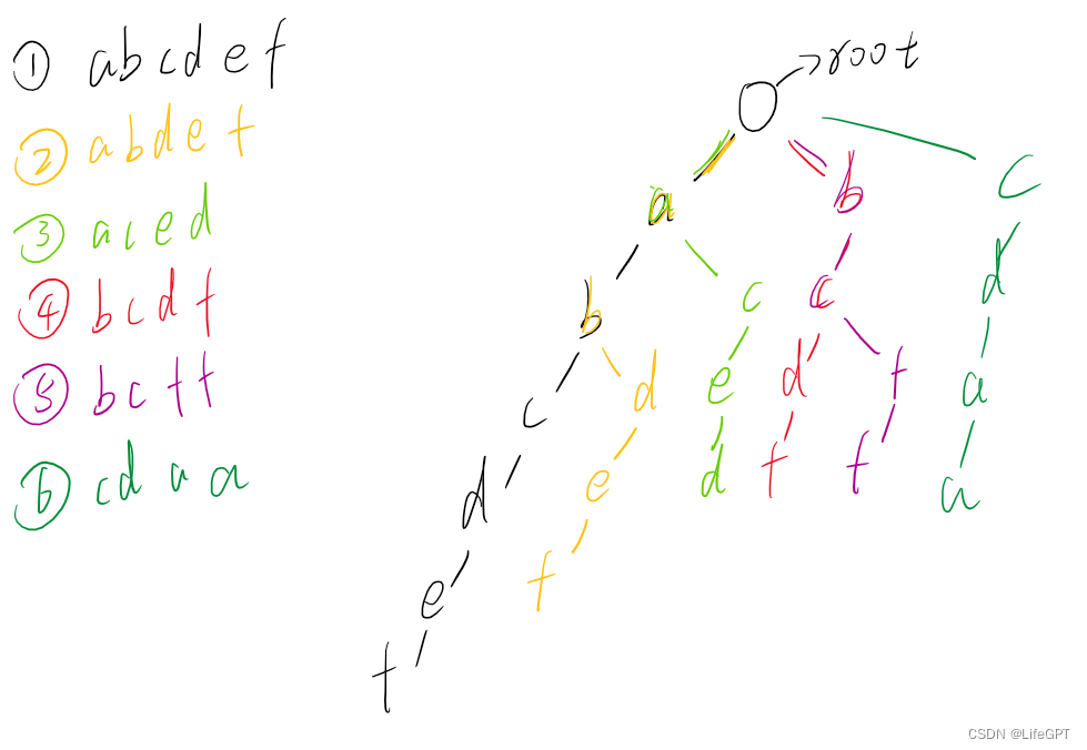 我们回到刚刚每一条字符串,然后依次在树中进行查找,可以发现每一个字符串的结尾,在这一棵树中都是最后一层的位置,也就是说,我们可以通过这些标记过的位置往回走,一样可以得到原来的字符串。