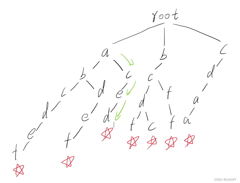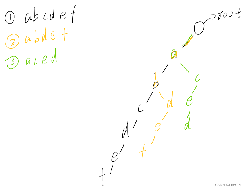 至此,我们的字符串集合已经全部存入到这一颗树当中去了,并且我们可以发现,字符串集合中的每一个字符串,都可以在树中通过对应的路径得到。