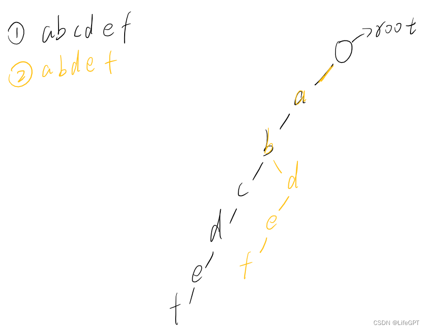 首先在一开始,我们的树是空的,只存在一个root根节点(可以视为一直存在),然后当我们从第一个字符串的第一个字母开始存储时,我们会率先查找树的两个子节点是否已经存储过这个字符,如果没有,我们就创建一个子节点来存储这一个字符,如果有,我们就转移到树的存储该字符的那一个节点上,以它为新的根节点,然后开始存储第一个字符串的第二个字符......