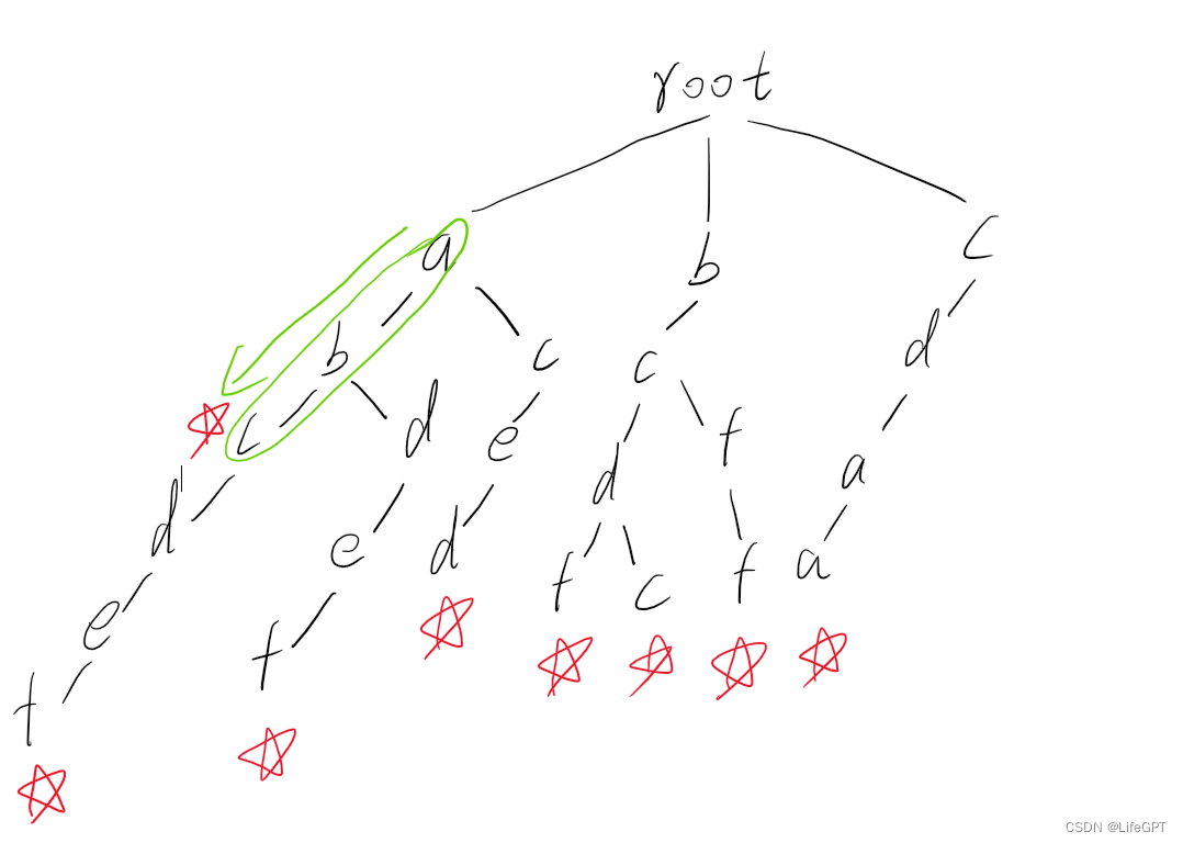 但是若是我们要寻找abcf,那很明显,根据同样的道理,我们是找不到的,因为当我们在路径的