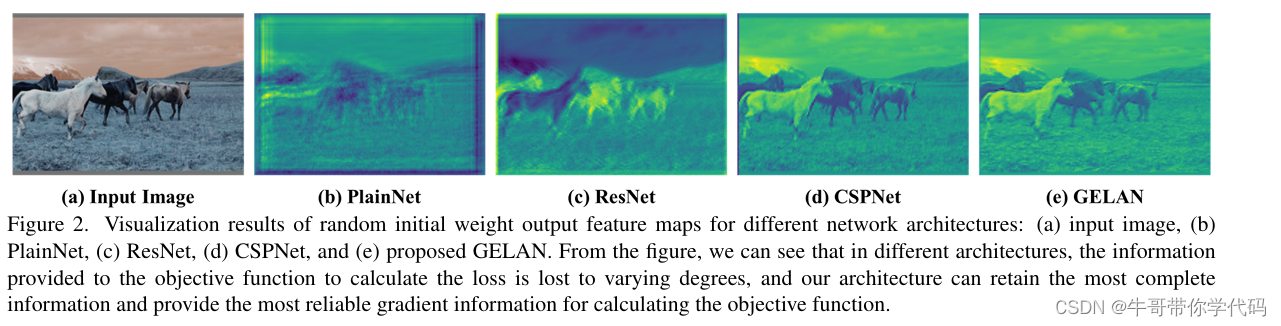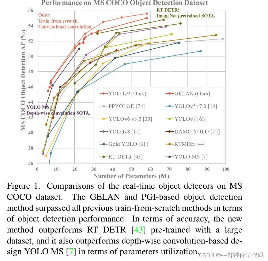 文章提出了可编程梯度信息(Programmable Gradient Information, PGI)的概念以及通用高效层聚合网络(Generalized Efficient Layer Aggregation Network, GELAN)的设计。结合上述两个全新的概念,是的YOLOv9模型相较以往,更好地解决了深度学习模型中的信息丢失问题,特别是在对象检测这类复杂任务中。
